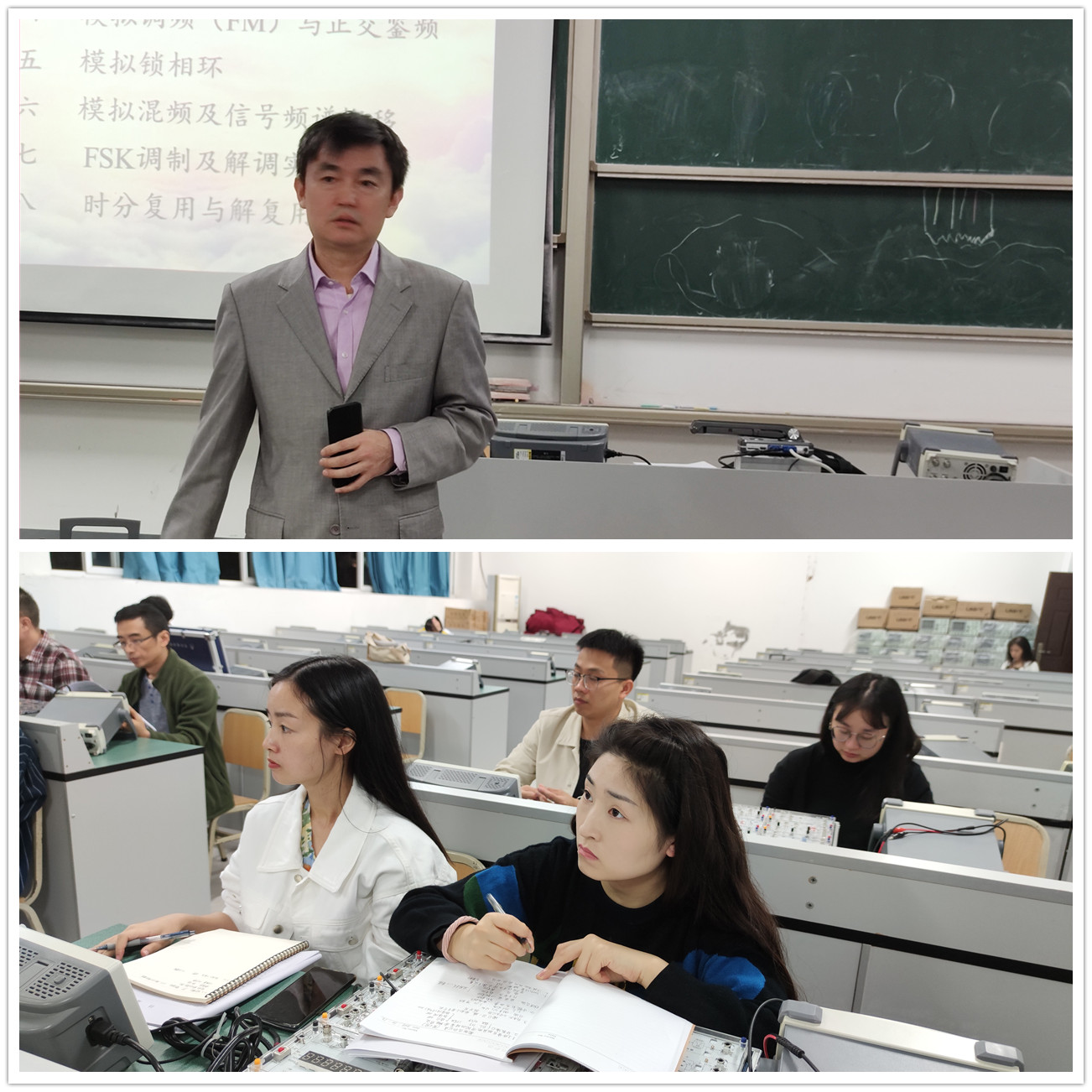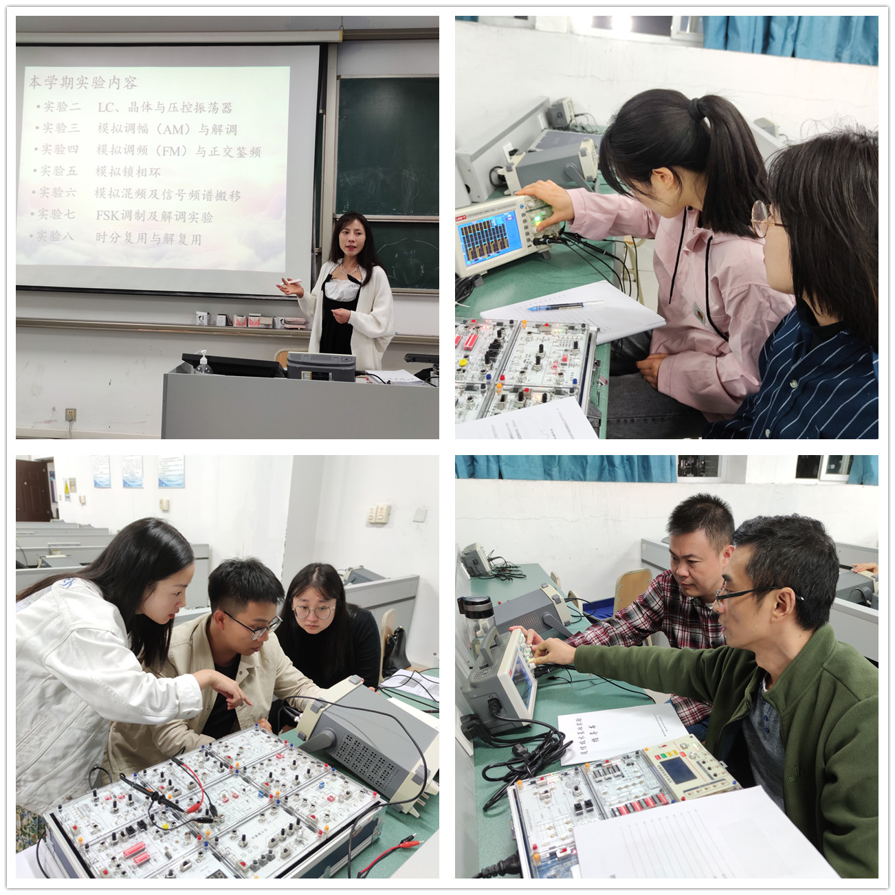 之后,董妮娅老师结合《通信技术基础实验》课程,详细讲解了课程内容安排、仪器仪表使用方法及操作安全注意事项。讲解完后,董老师耐心细致地给各位老师一一演示了示波器和试验箱各个模块的功能。老师们边聆听边操作,很快就熟悉了各个仪器仪表的使用方法,顺利地完成了实验参数的测量。