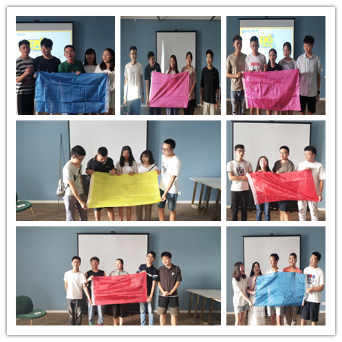 接下来的破冰游戏,五人组建一个团队,要在短短十几分钟内互相了解然后设计队旗队名和口号,时间不得不说非常紧迫了,但大家迅速的进入了状态,分工合作,各个小组脑洞大开,组员们集思广益发挥自己的特长最终在十几分钟后交出了自己的答卷。8个小组,8个不同的风格,向大家一一展示,每个团队都展出了他们的特色特长,比如蟹堡王组合,他们的队旗是五个动漫手牵手,他们的想法就是能够像蟹老板一样把自己的项目做大做强,闻名整个比奇堡。