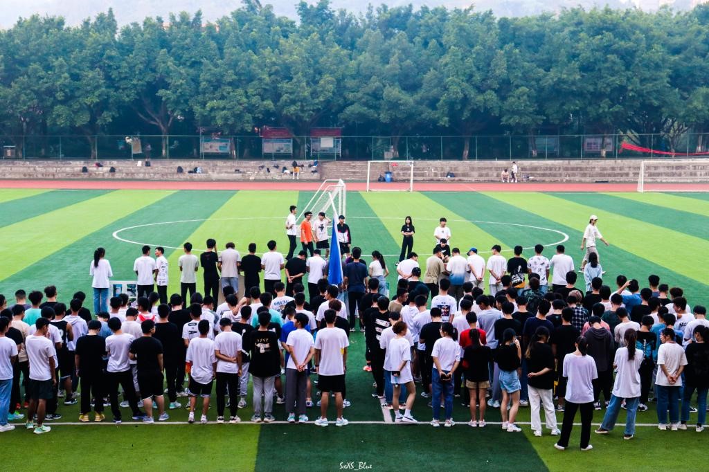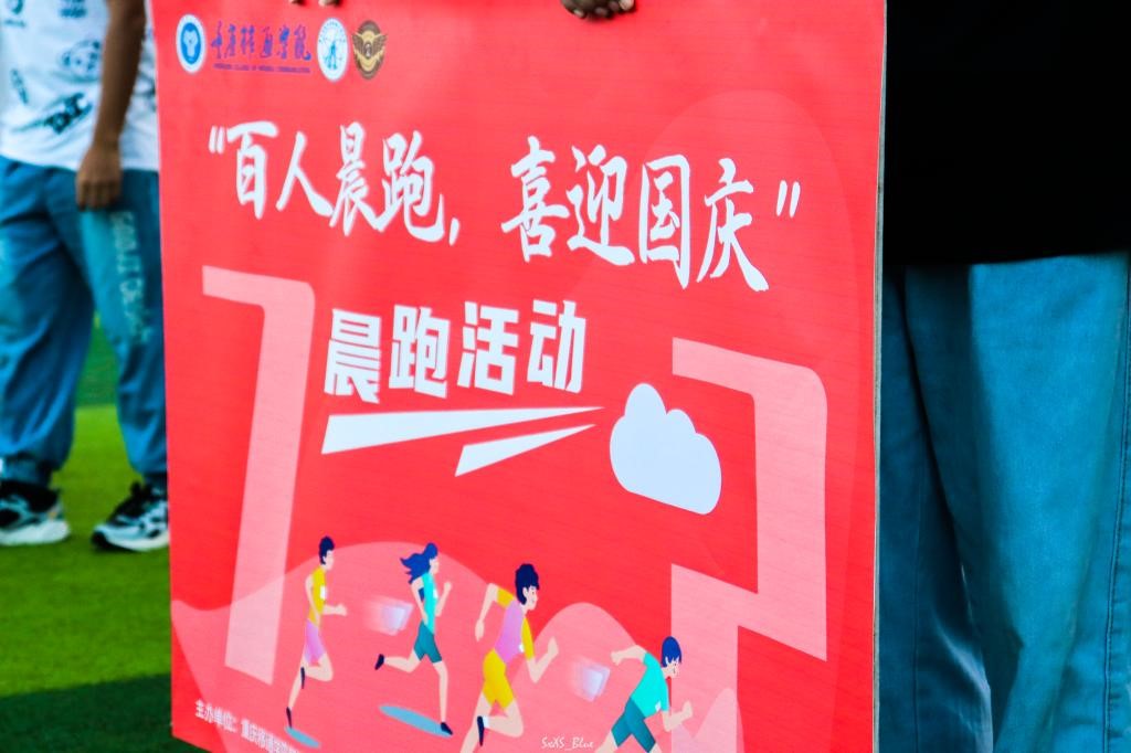 各班级整齐有序走进跑道。站在整个方队前的学生挥舞着院旗,站成一个个方队的同学们脸上贴着国旗小贴纸,洋溢着灵动与活力之气。在体育协会负责人开跑口令后,“百人晨跑 喜迎国庆”活动正式开始!