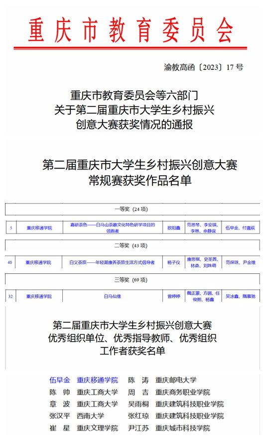 近日,从重庆市教育委员会传来喜讯,我校在第二届重庆市大学生乡村振兴创意大赛中囊括一二三等奖和优秀指导教师奖。其中伍早金、付露萩老师指导的“嘉研茶色——白马山茶趣文化特色研学项目的领跑者”项目喜获一等奖;范保珠、尹金维老师指导的“白义茶旅——年轻潮康养茶旅生活方式倡导者”喜获二等奖;吴冰鑫、隋慕驰老师指导的“白马仙缘”项目喜获三等奖,我校书院部学生发展导师伍早金荣获“优秀指导教师”称号。