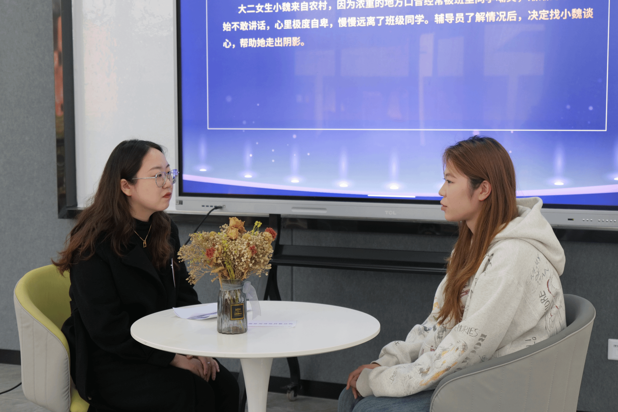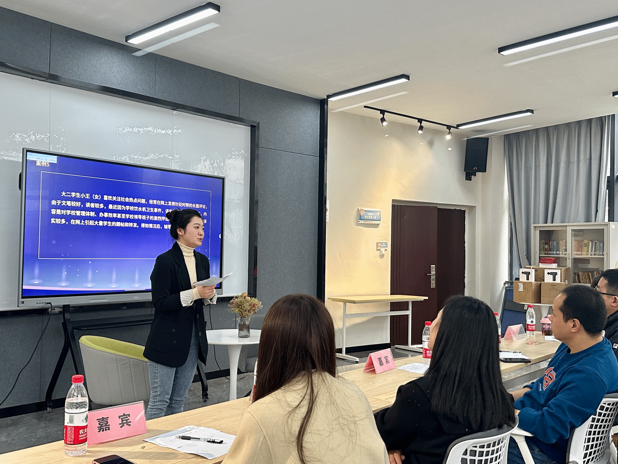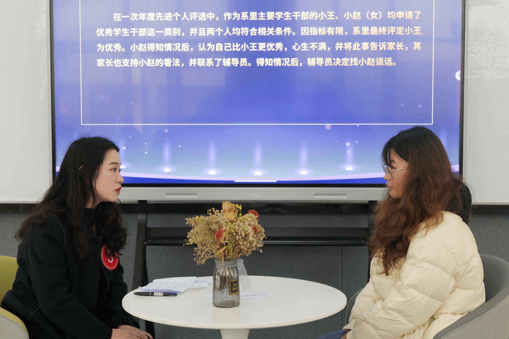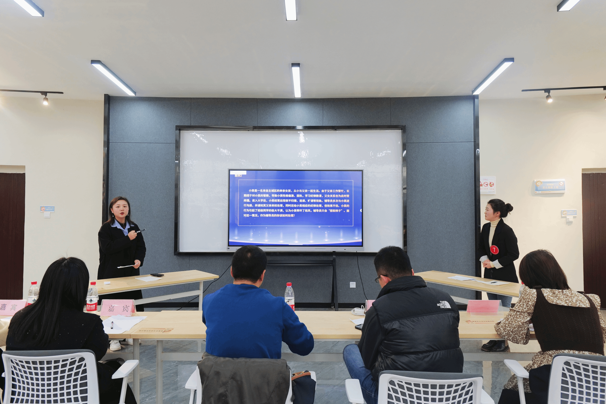本次决赛分为案例研讨和谈心谈话两个环节。分析研判案例,是辅导员的基本功,提升案例分析解决能力是辅导员职业成长的重要内容,也是提高育人实效的有力抓手。决赛现场,4组选手针对随机抽取的案例,以“你问我答”的形式两两比拼。在比赛过程中,各位辅导员老师展现出优秀的案例分析能力和丰富的理论知识储备,找到案例关键点攻坚克难,探索问题抽丝剥茧,牢抓细节总结经验,充分展现出我院辅导员老师的优秀专业素养。