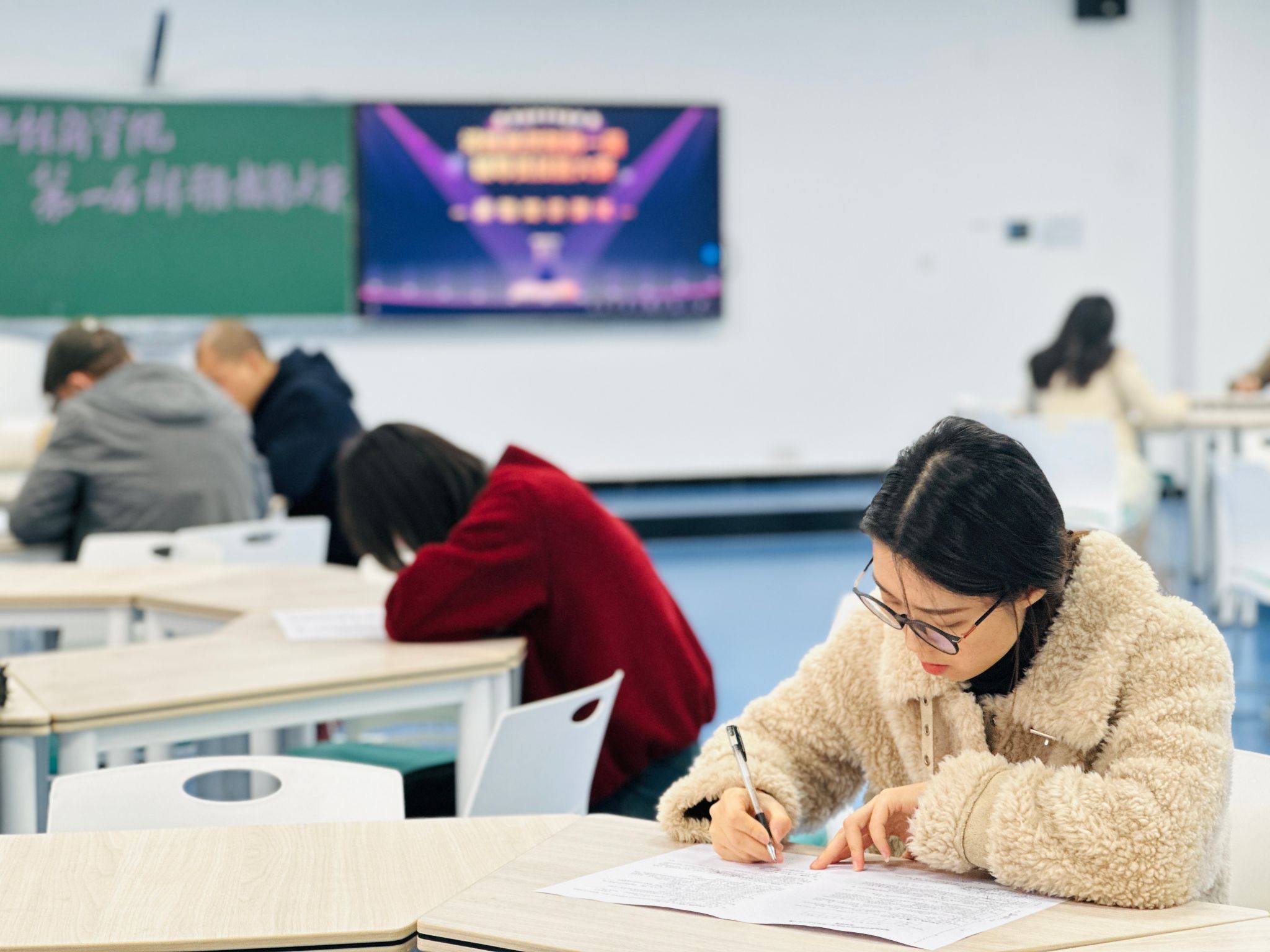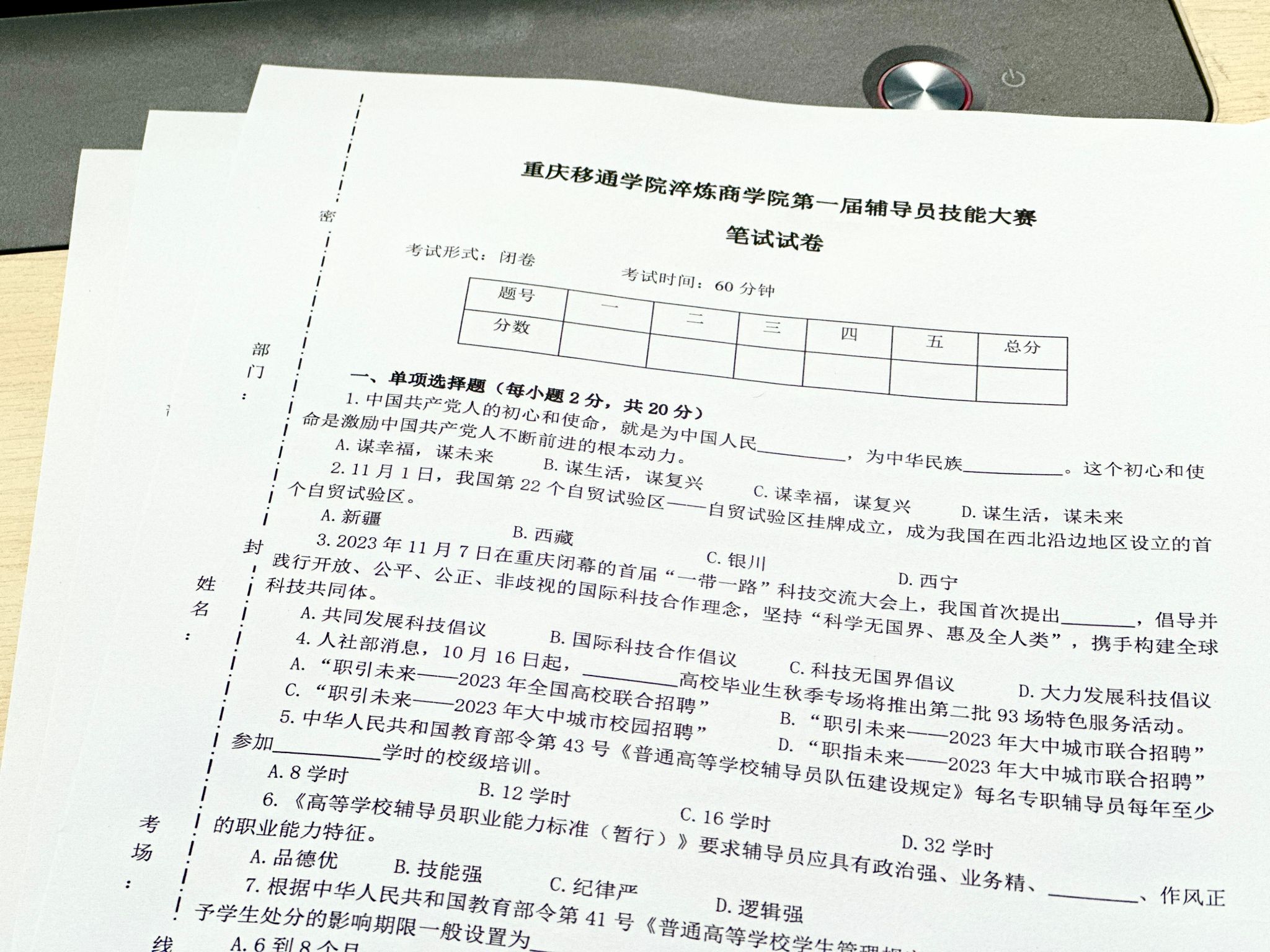 本届辅导员技能大赛采取晋级制。11月14日,淬炼商学院共计19名辅导员在五教智慧教室进行了初赛环节“基础知识测试”比拼。60分钟闭卷作答,测试内容主要包括最新时政、党和国家关于高校思想政治工作的重要会议和文件精神、辅导员业务素质和专业知识、完满教育相关解读等。最终王玉勤、张琳曼、杨伦芳、周瑜、叶洵、唐银桧、梁倩、张竞艺等八位辅导员老师突出重围进入决赛。