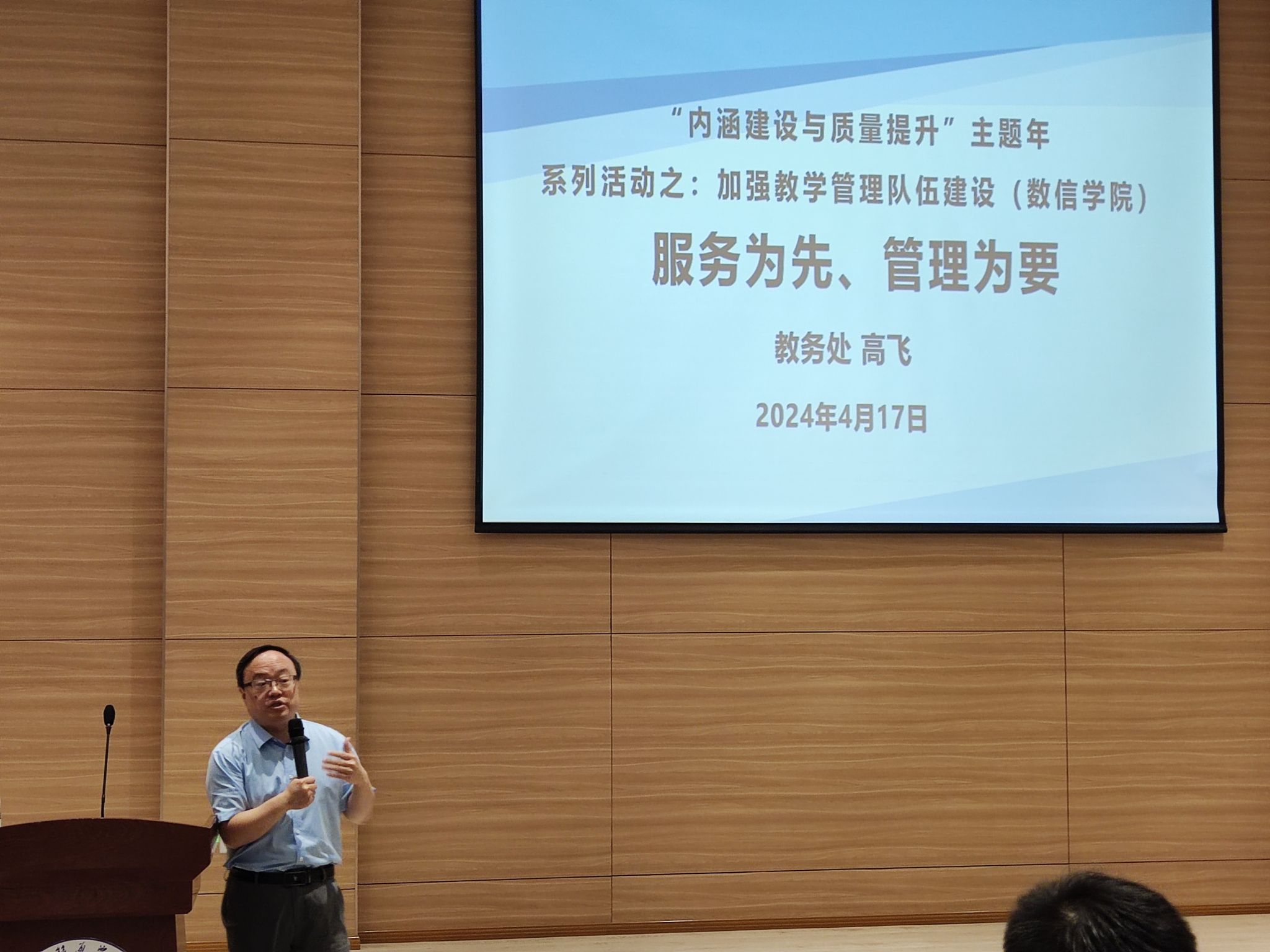 为深入贯彻《重庆移通学院“内涵建设与质量提升”主题年活动方案(移通教〔2024〕4号)》文件内涵,2024年4月17日下午14:00,数字经济与信息管理学院邀请教务处处长高飞教授在六度空间·创梦空间作《服务为先,管理为要》的主题报告。本次报告会由副院长刘贵容教授主持,合川校区全体教职工参与本次报告会。