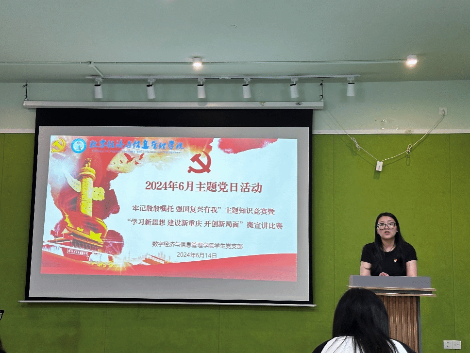 为进一步深入学习贯彻党的二十大精神,激发广大党员的责任感和使命感,数字经济与信息管理学院第一、第二党支部于6月14日15:00在双栀书院多功能影音室开展6月主题党日活动,活动以“牢记殷殷嘱托 强国复兴有我”知识竞赛暨“学习新思想 建设新重庆 开创新局面”微宣讲比赛为主题开展,支部全体在校党员参会。