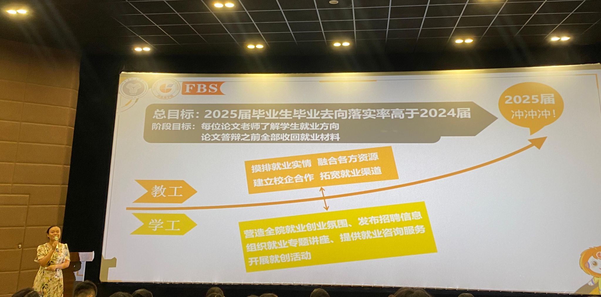 随后,淬炼商学院学工副院长刘薇唯对淬炼商学院学生工作及毕业生就业工作进行了汇报。刘院长重点分析了2025届毕业生就业形势,以“2025届毕业生毕业去向落实率全力冲顶”为总目标,详细部署了相关工作,提出学工和教工形成合力,建立“学工+教工”双向就业合作队伍,通过每周网格化交流、阶段性一对一交流等方式进一步加强就业指导服务,完善就业信息平台,拓宽就业渠道,努力提升学生就业竞争力,确保每一位毕业生都能找到满意的工作。