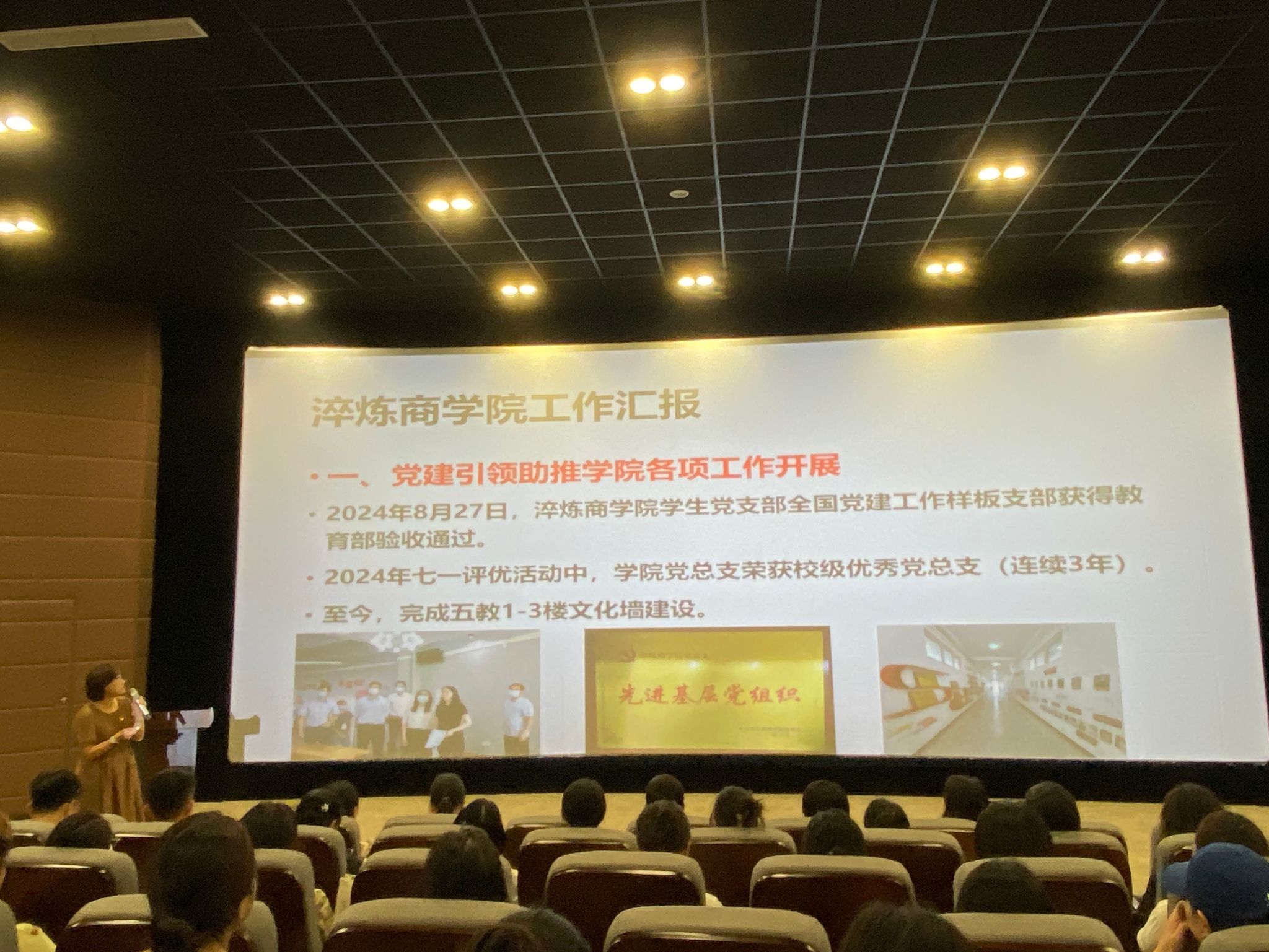 会议第一项,淬炼商学院主持工作副院长曾璐进行了详细的工作汇报。首先,曾璐院长带领大家回顾了上一学年的工作。曾院长提到,上一学年学院在党建引领下全面贯彻落实新商科培养模式,专业建设品牌外部影响力增强,青年教师教学能力持续提升,学科竞赛成果丰硕,各方面取得显著成绩。其次,曾院长对学院新学期的工作进行了全面部署,她强调,新学期我们将继续围绕学校“双一流之外的首选大学”这一品牌价值主张,继续坚持“信息产业实战型商学院”办学定位,践行集团新商科人才培养模式,紧紧围绕本科教学评估做好制度建设、专业建设、课程体系建设、融合实战继续做好内涵建设,将信息产业实战型商学院品牌价值广泛传播。最后,曾院长请本学期新入职的老师作自我介绍,并根据学院的工作部署分享自己未来的工作目标和规划。