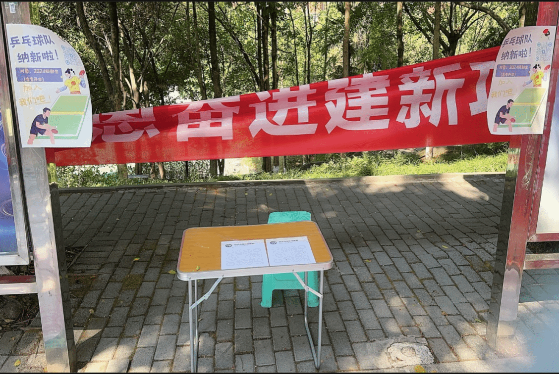 9月19日,老队员们对招新点进行布置。之前线上的一些新生来到线下报名点填写表格并进行咨询,值班队员们耐心介绍球队情况、考核标准、考核时间、队规等,让每一个热爱乒乓球的新生感受到乒乓球队家的温暖。
