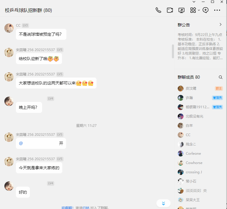 9月18日,教练组及乒乓球队校队队员一起召开了线上会议,讨论关于线下招新事宜。布置了招新任务。由几位队长负责统筹招新点的布置、值班表的安排、招新疑问解答等。并讨论了招新的考核标准与流程。