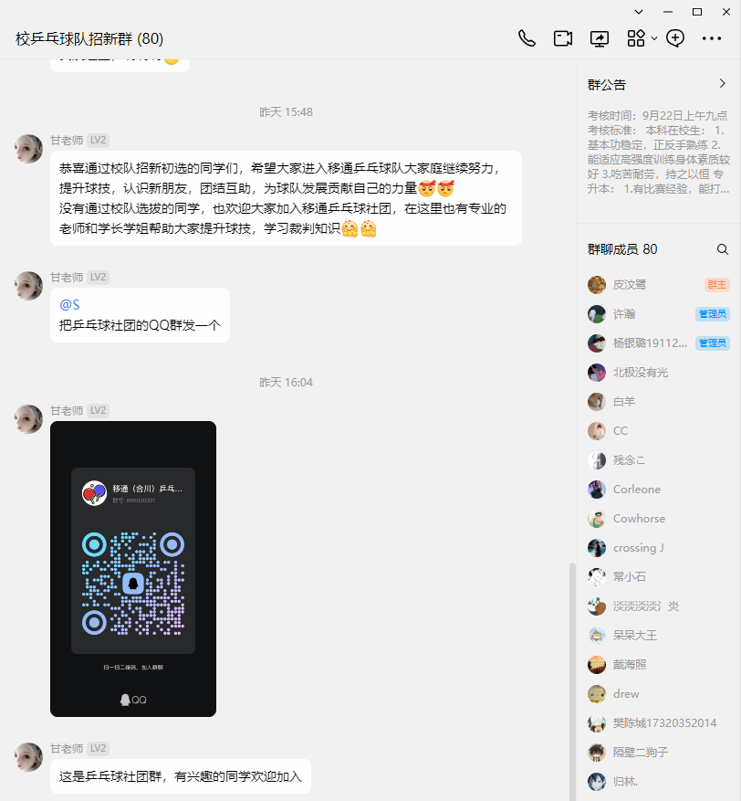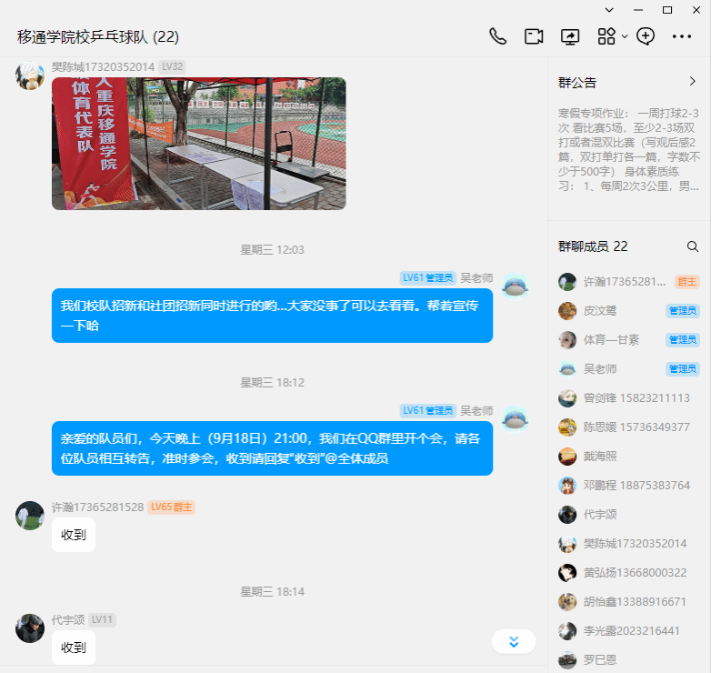 炙热的天气使得开学延迟,招新工作却刻不容缓,校乒乓球队在前期工作的引领下通过社交平台、学校官网和校内论坛等渠道进行线上宣传。宣传内容包括招新海报、校队荣誉照片、校队日常训练及比赛视频等。让新生们能直观感受校乒乓球队的热情、激情与团队文化。在校乒乓球队招新群中,老队员详细的介绍球队的历史荣誉、教练团队和训练场地设施等,并分享自己在球队中的成长经历,让新生感受到乒乓球大家庭的温暖与活力。