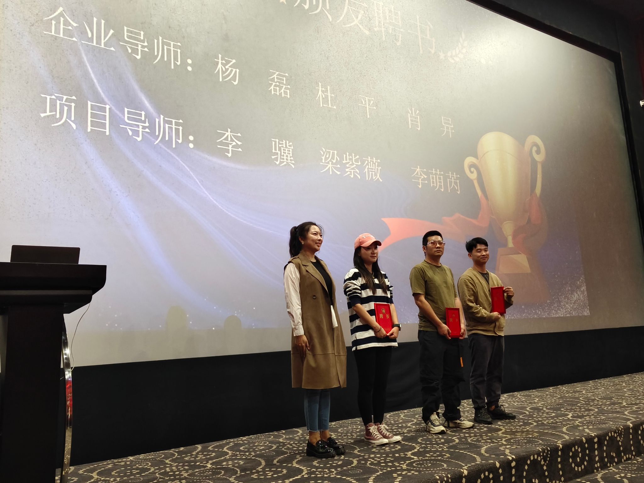 紧接着,电影商务产业副院长张云潇老师上台进行致词。张云潇副院长先对学员们的加入表示欢迎,而后向学员们介绍了电影商务产业学院实训班的课程以及授课导师,同时表达了对于学员们积极参与课程实践项目的美好期待,张副院长的讲话激发了学员们对于本期课程极大的学习兴趣,和对未来的课程学习的期待,最后张副院长为企业导师和项目导师颁发聘用证书。