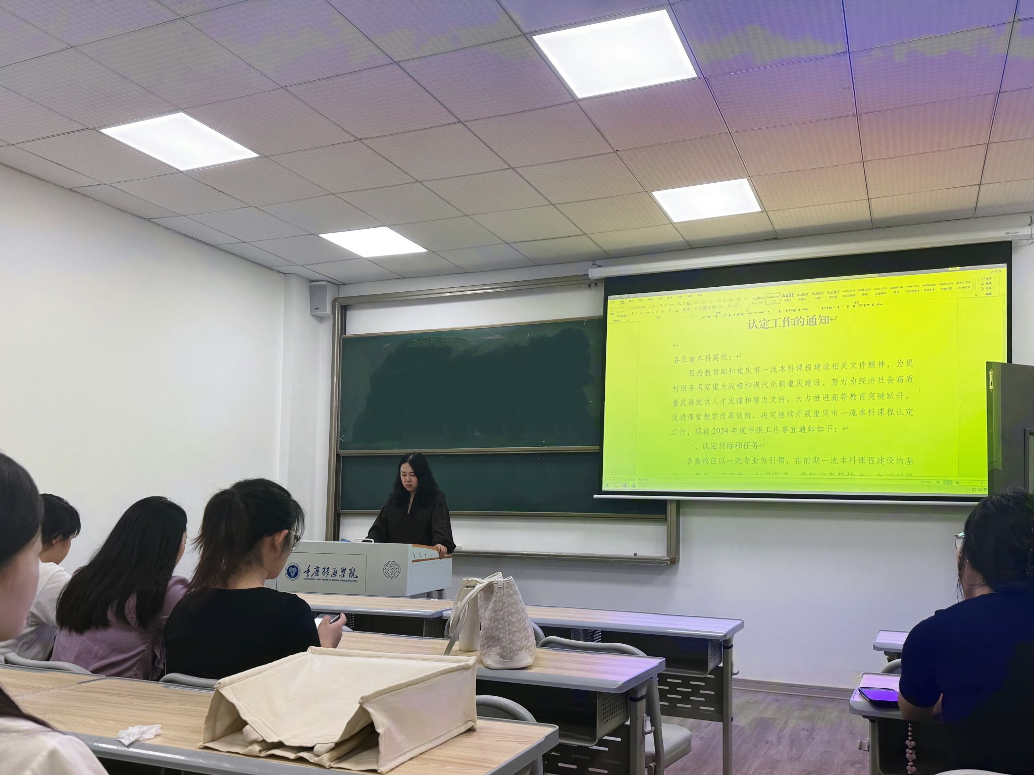 随后,毕老师对标《重庆市教育委员会关于开展2024年高校一流本科课程认定工作的通知》,详细介绍了一流课程认定范围和类型、申报要求及相关工作安排。她强调,课程是人才培养的核心要素,课程质量直接决定人才培养质量,一流课程是实施一流人才培养工作的重要支撑。在一流课程申报材料的准备上,要深入理解一流本科课程建设的内涵,明确一流本科课程建设的目标。同时鼓励老师们对申报工作持有信心,平日注重素材的积累,不断优化教学设计,创新教学模式,共同打造高质量思政“金课”。
