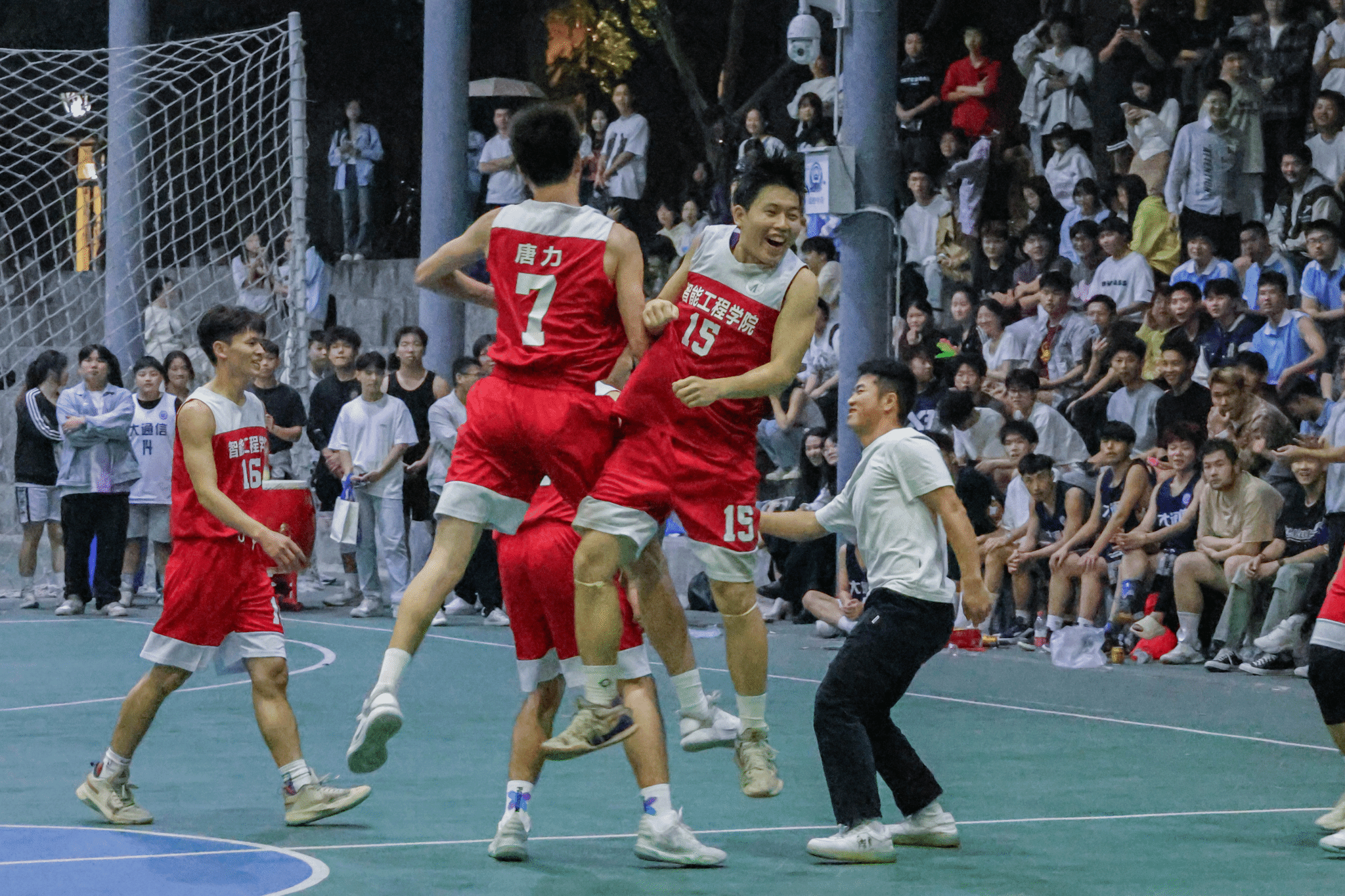 初赛中,智能工程学院男子篮球队以大比分优势遥遥领先。在面对一个又一个强大对手时,他们始终保持冷静的心态和必胜的信念,在每一场比赛中稳扎稳打,发挥出高水平,一路挺进决赛。风雨篮球场上那一抹抹奔跑的红色,显得格外耀眼,每一次投篮都体现出他们对篮球的热爱。决赛中,队员们面对强劲的对手和紧张的比赛氛围,依旧凭借默契的团队和出色的个人表现,最终以61:52成功卫冕冠军,为学院争得荣誉。观众席上,智工学子激情澎湃的加油声响彻整个篮球场,点燃了男篮队员们的激情。