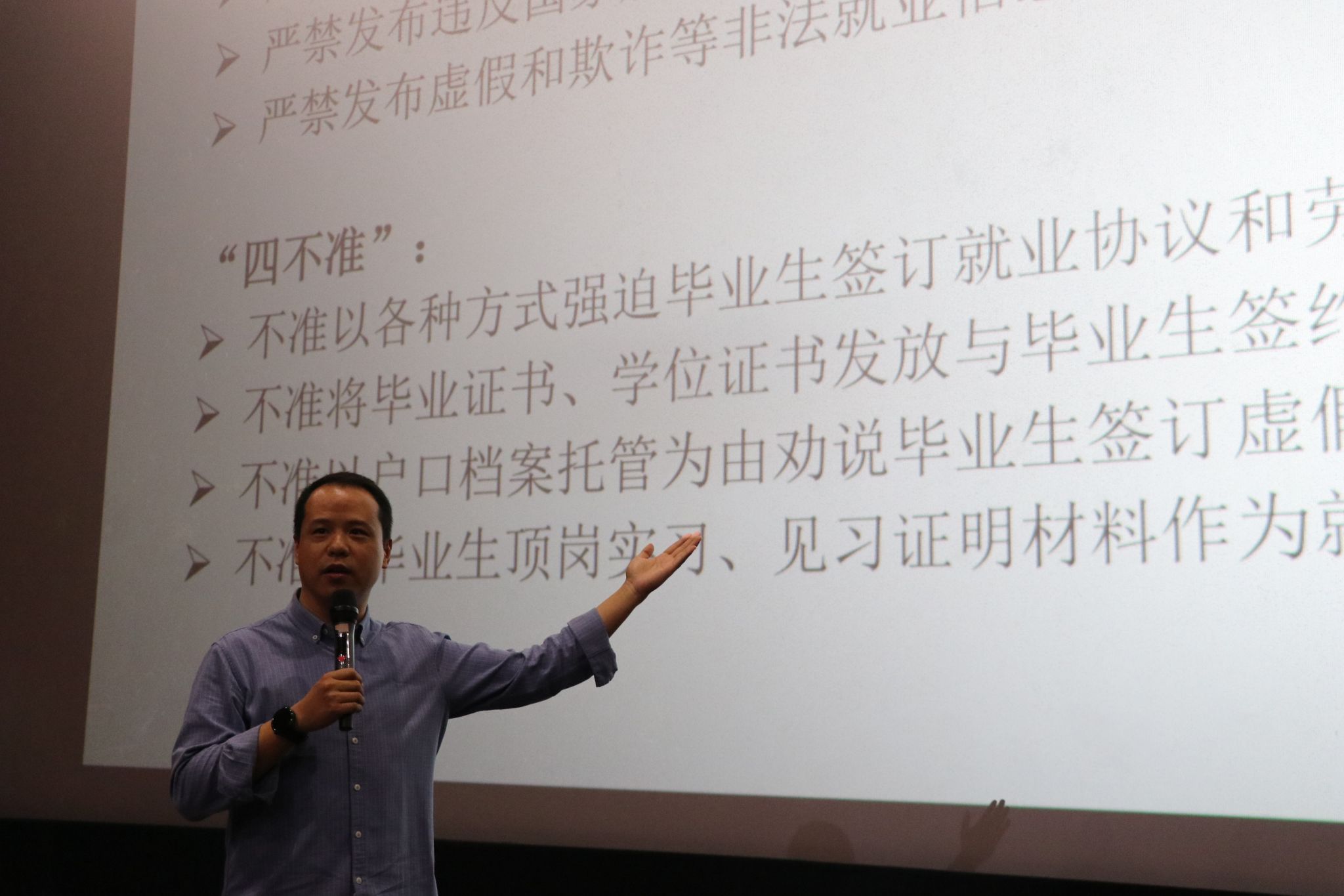 会议伊始,就业创业指导与服务中心职业指导科副科长伍早金老师为参会的各位老师对当前全国就业形势进行了全面而深入的分析。他结合最新的就业数据、政策导向以及行业发展趋势,指出了当前就业市场的新特点、新挑战和新机遇。伍老师强调,随着技术的不断进步和产业结构的转型升级,新兴行业对人才的需求日益增长,而传统行业则面临转型升级的压力,这对高校毕业生就业提出了新的要求。他鼓励学院应紧跟时代步伐,加强对学生专业技能和创新能力的培养,同时拓宽就业渠道,加强与企业的合作,为学生提供更多元化的就业机会。
