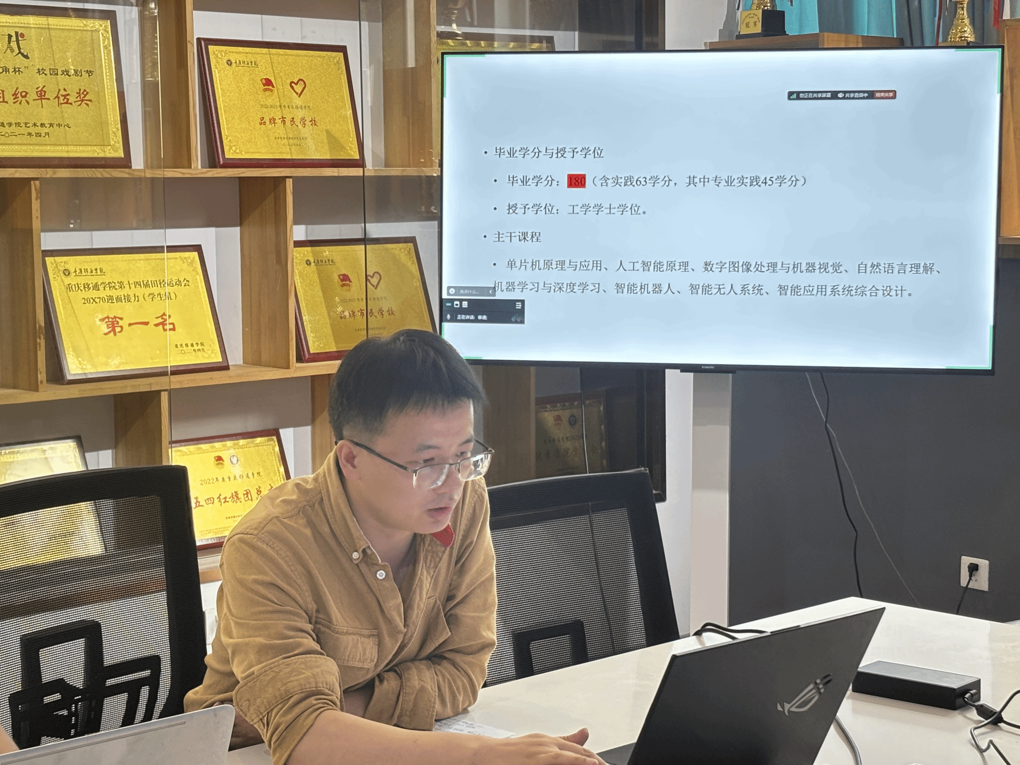 最后由人工智能专业负责人赖小龙介绍本专业的培养方案,培养方案介绍完毕引发了三位专家的热烈讨论。杨波教授关注专业的招生与就业形势,并建议增加偏软的实验课程内容,同时参考其他高校。邓军则提出减少硬件课程比重,增加数学建模、大数据算法等偏软课程,并强调机器学习课程的重要性,建议提前Python课程。冉星则从实际需求出发,建议增加基于场景行业的实验课程内容,以提升专业的应用性和实用性。
