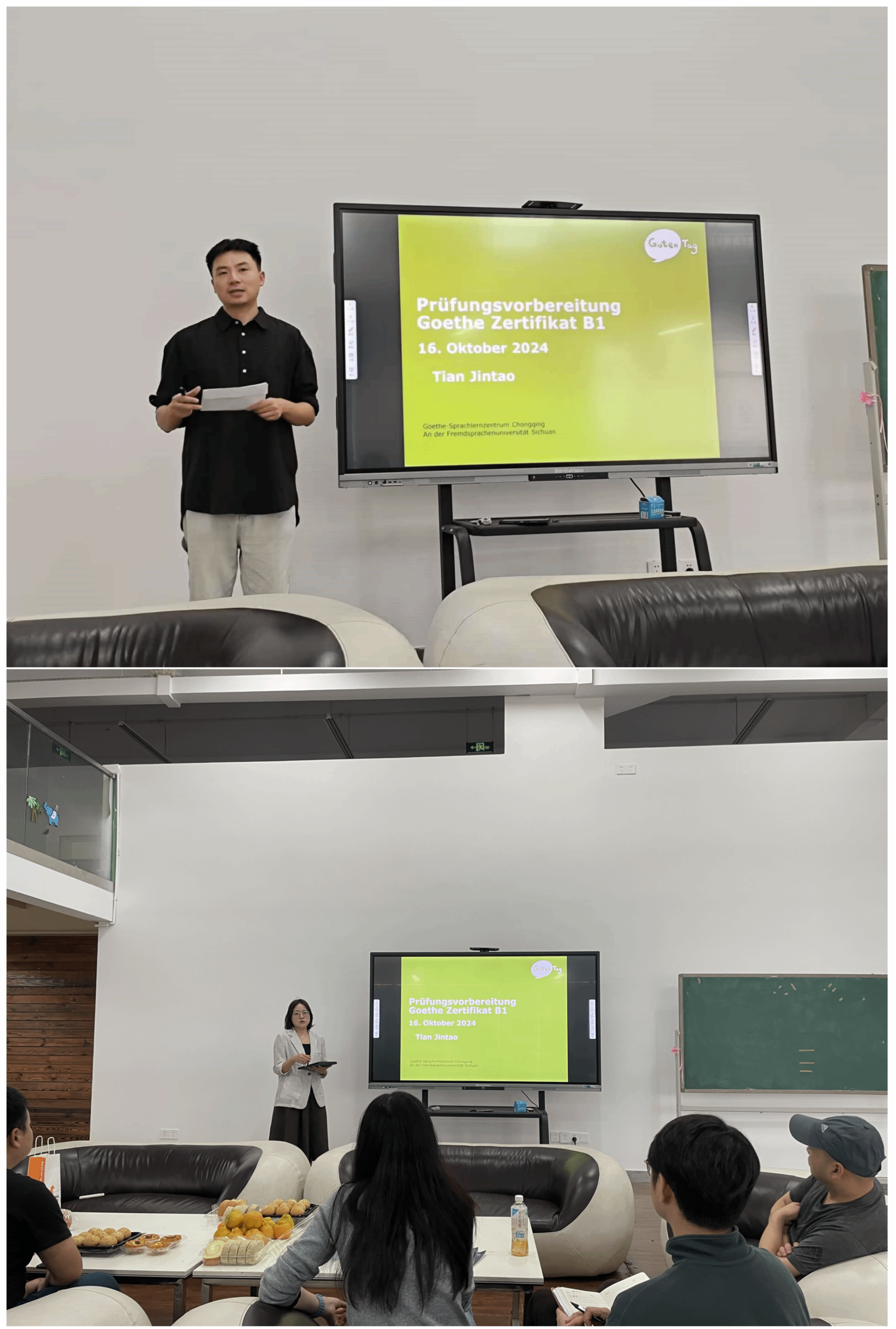 为帮助我校中外合作办学项目学生提升德语水平并顺利通过歌德语言等级测试,10月16日下午,德国工程学院特别邀请了四川外国语大学歌德语言中心考试负责人田进涛老师在德工悦读圈开展主题为“欧标德语B1等级考试专家解读与指导”的讲座。讲座由张亮老师主持,德国工程学院全体德语教师参与此次活动。