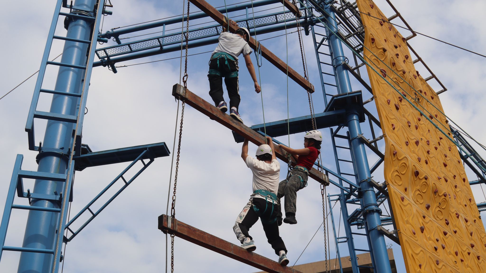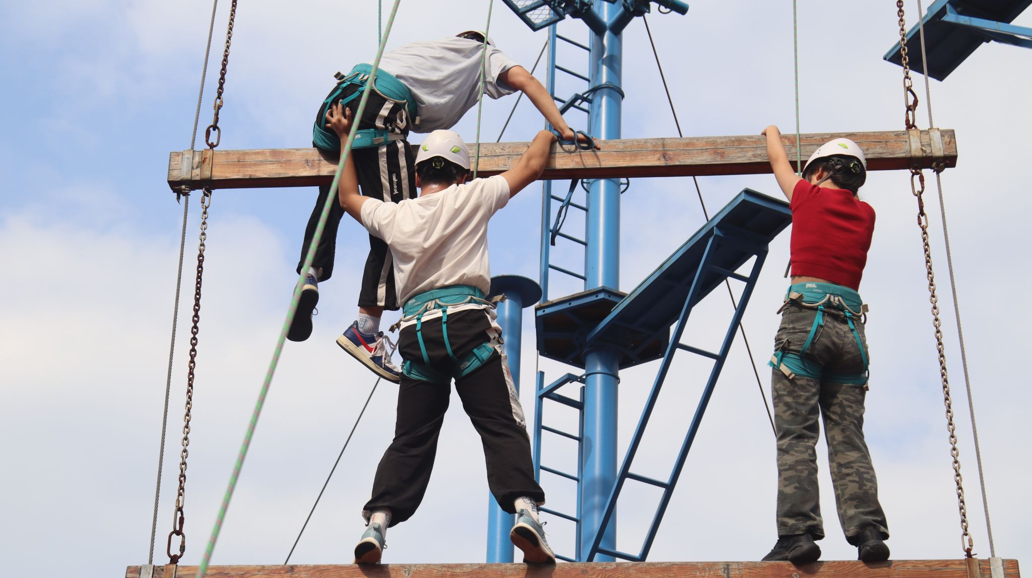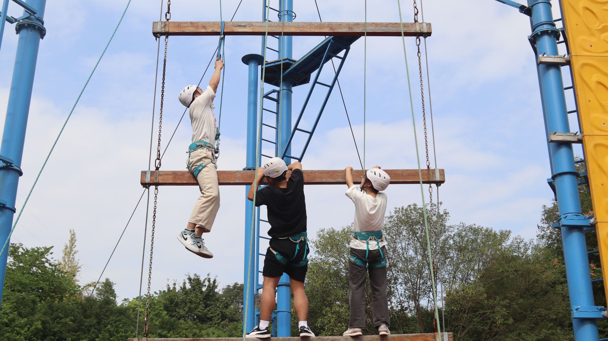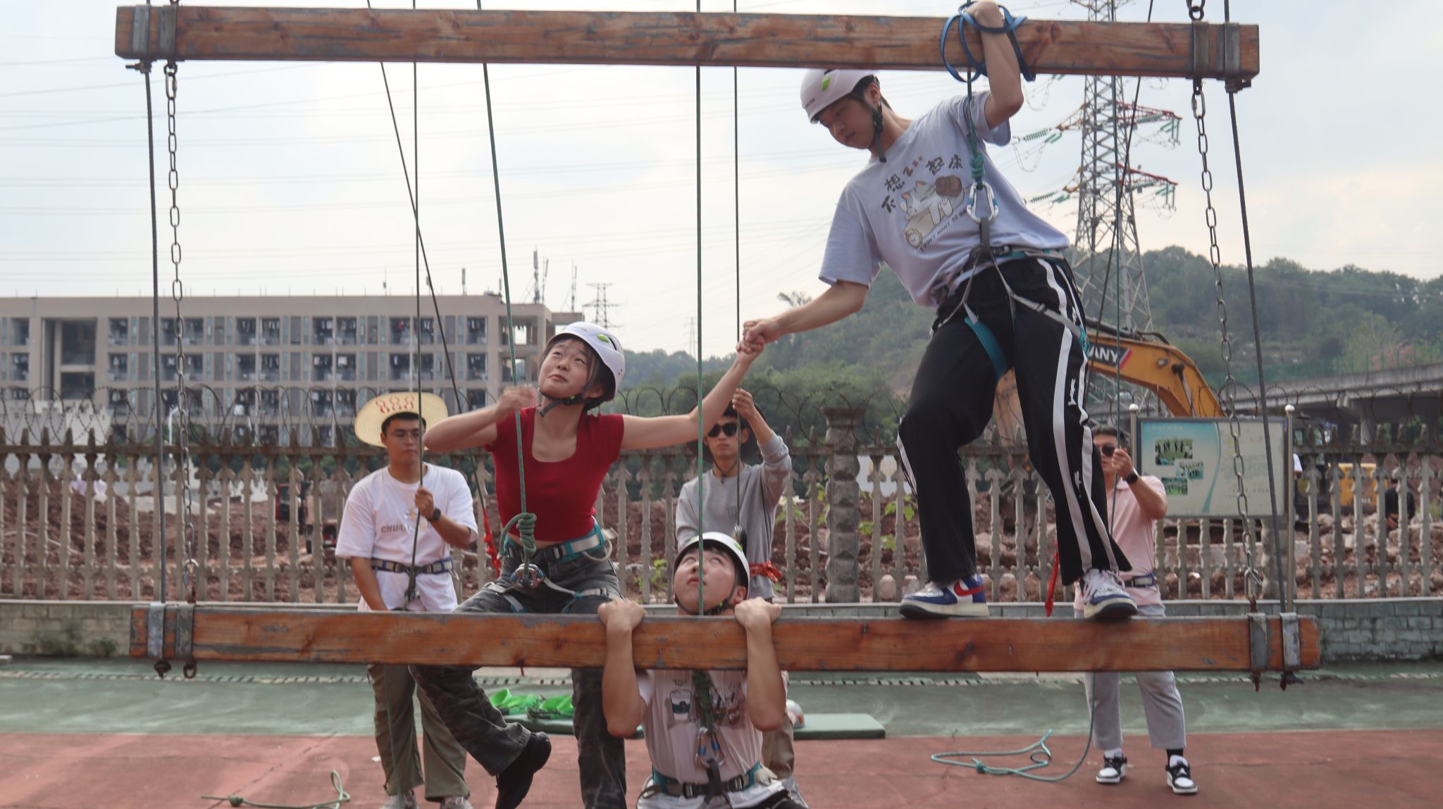 高空项目中,队员们面对挑战,毫无畏惧,他们互相鼓励,一步步攀向高空。当他们触及天梯的顶端,现场响起了热烈的掌声和欢呼声,那是对他们勇气和努力的最高赞誉。