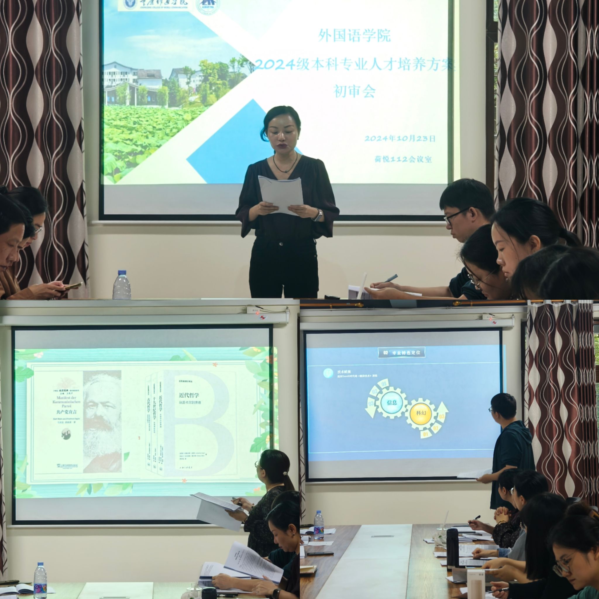 为持续深化教学建设与改革,加强专业和课程建设,10月23日学院组织校内外评审专家召开了2024级本科专业人才培养初审会。重庆对外经贸学院外语外贸学院李霓院长和重庆工商大学派斯学院外国语学院李卓院长、华夏航空教育科技产业有限公司客舱训练部教研主管吴颉受邀参与评审,学院院长、教学副院长、专业教研室主任、专业负责人、专业核心课程负责人共同参会探讨交流。此次会议由外国语学院副院长罗琳主持。