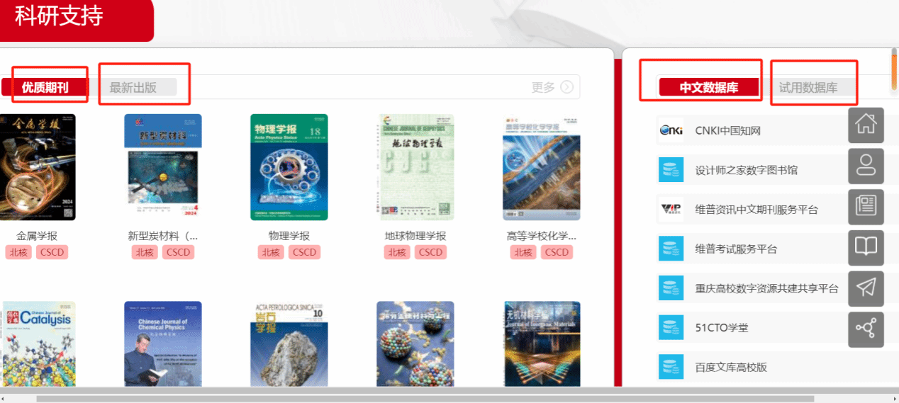 学院图书馆、阅读推广功能,为学院的专业课程推选出最前沿最权威的文献资源,优质期刊、最新出版、数字资源等。