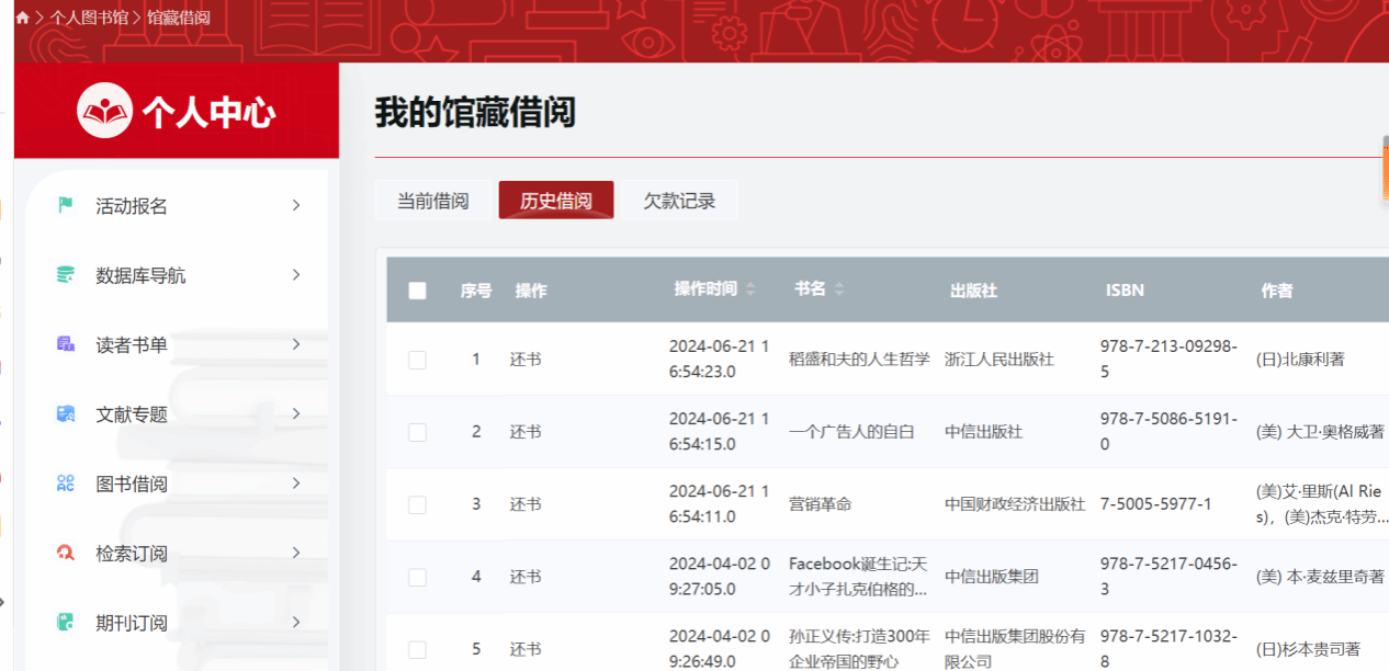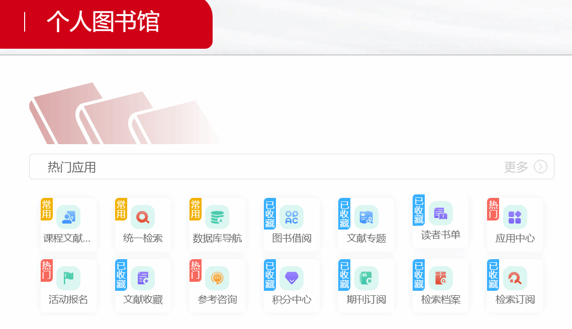个人图书馆,属于读者的个人空间,人性化的应用功能设计充分体现了图书馆以“读者为中心”的办馆理念,不仅能够为读者提供课程文献、统一检索、数据库导航、图书借阅、文献传阅等,还为学生读者参加阅读活动、到馆座位预约提供了便利。