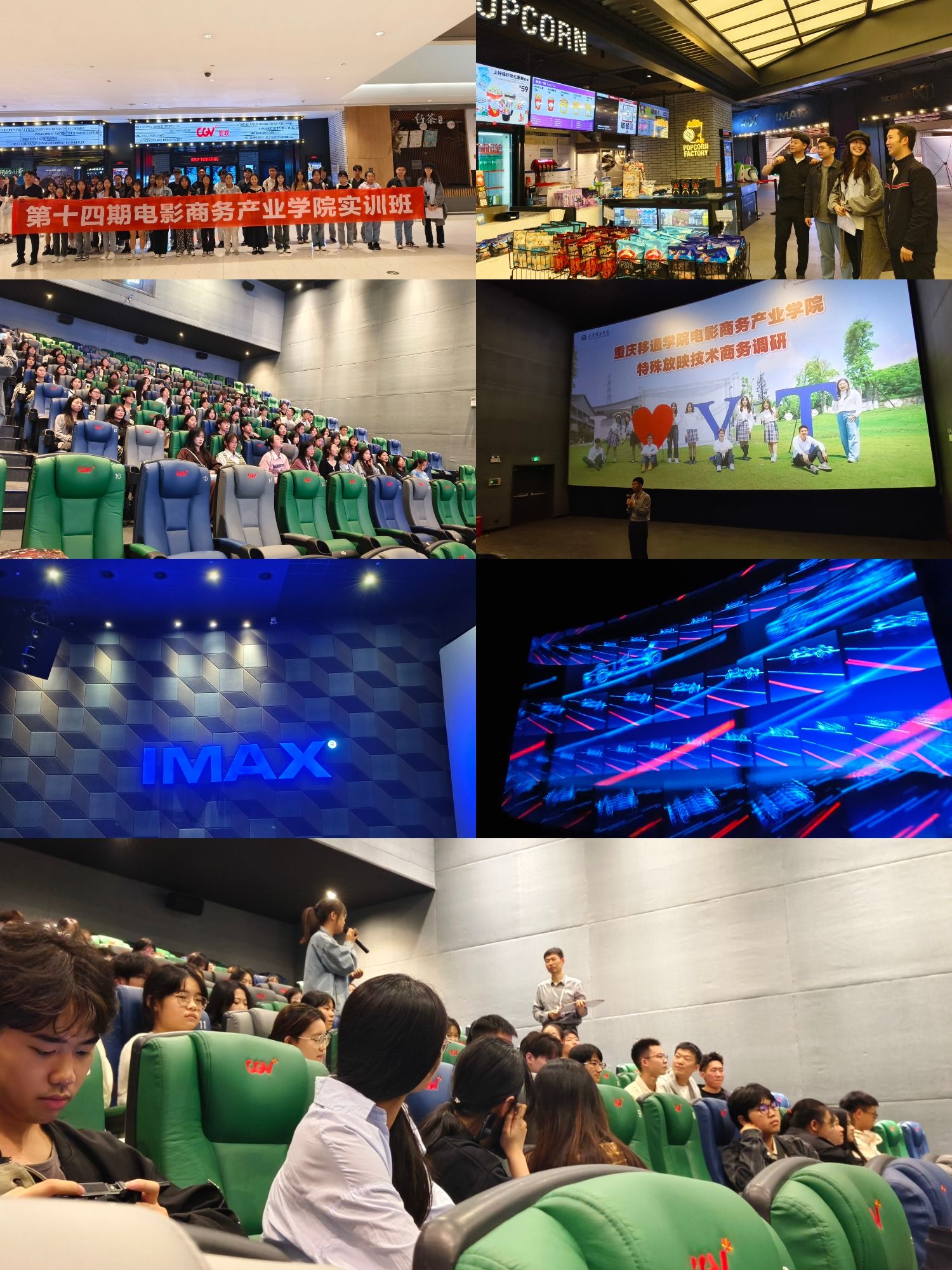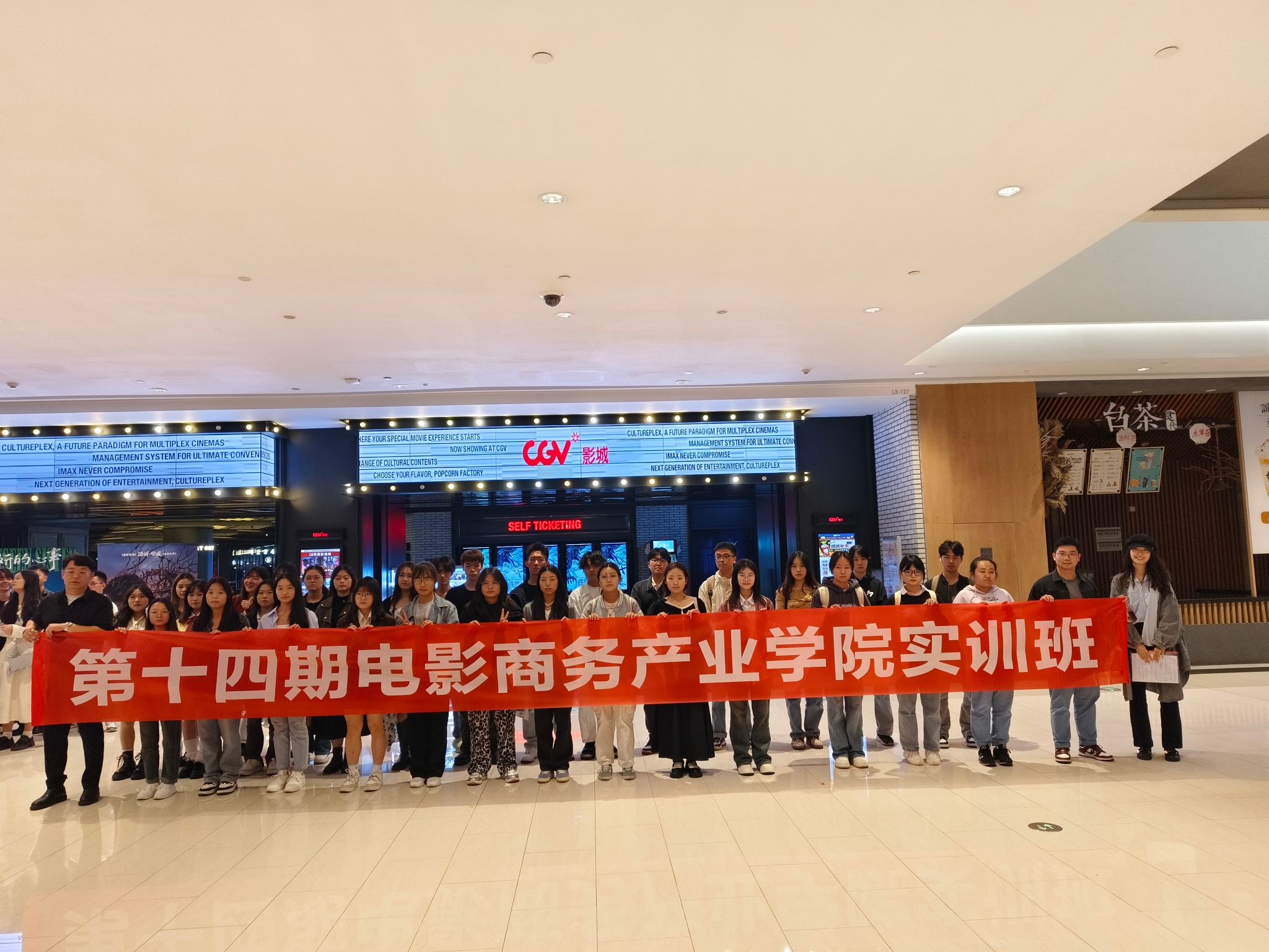 本次实训活动首先来到了CGV来福士影城。学员们怀着兴奋与好奇的心情,对IMAX和ScreenX放映厅进行了深入参观。影城工作人员热情地为学员们进行详细讲解,从放映技术的原理到独特的观影体验,一一娓娓道来。学员们认真聆听,并不时提出自己的问题,工作人员耐心地为他们进行解答。在这里,学员们不仅对先进的电影放映技术有了更直观的认识,也感受到了电影科技为观众带来的震撼魅力。讲解结束后,工作人员还为学员们分发了精美的海报,让大家在收获知识的同时,也留下了一份美好的纪念。