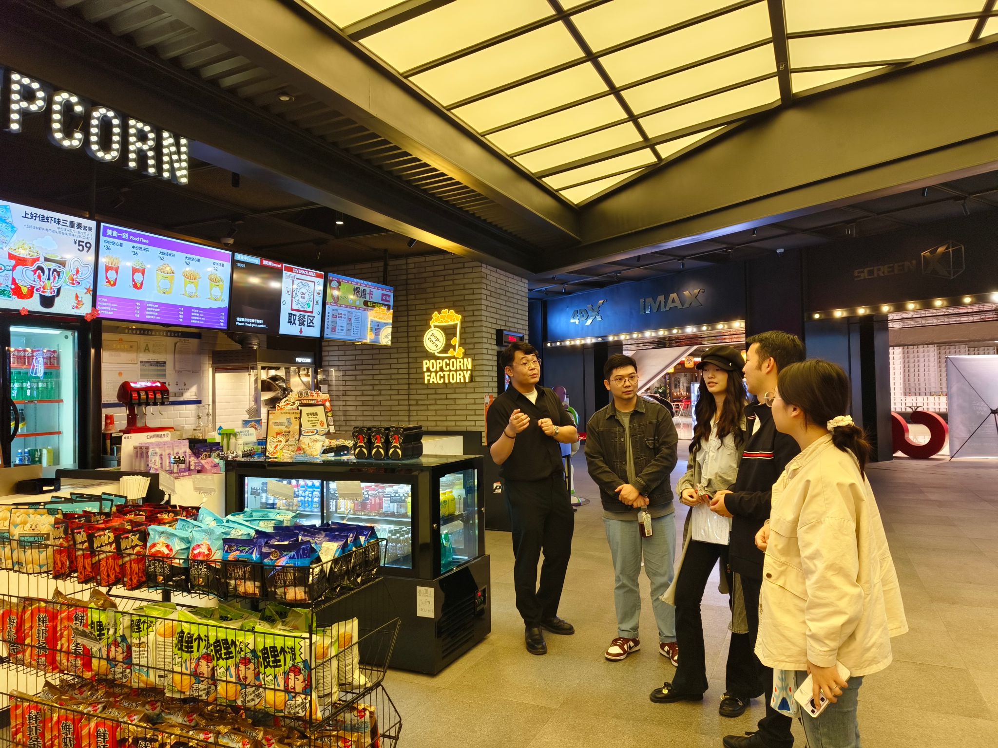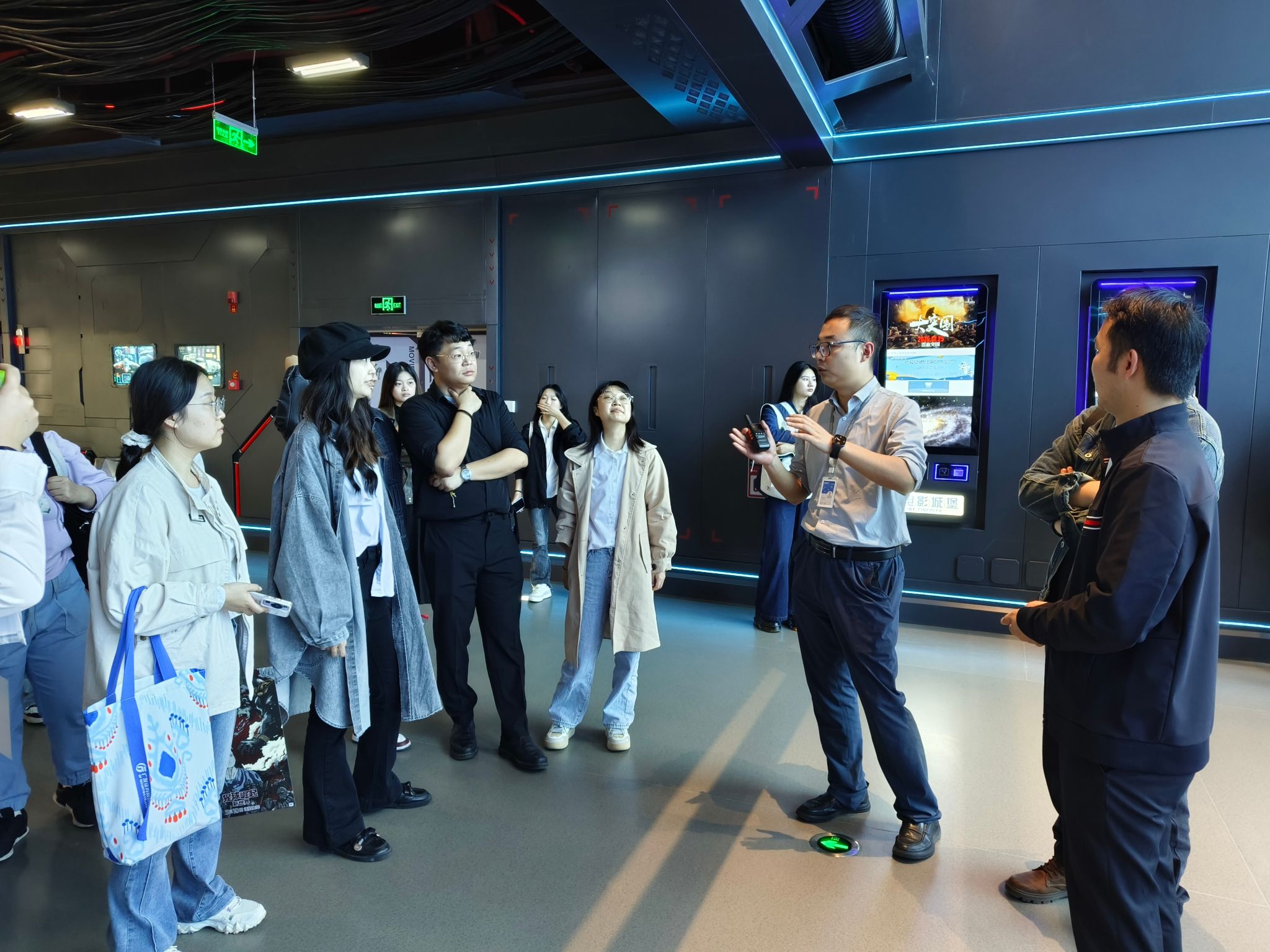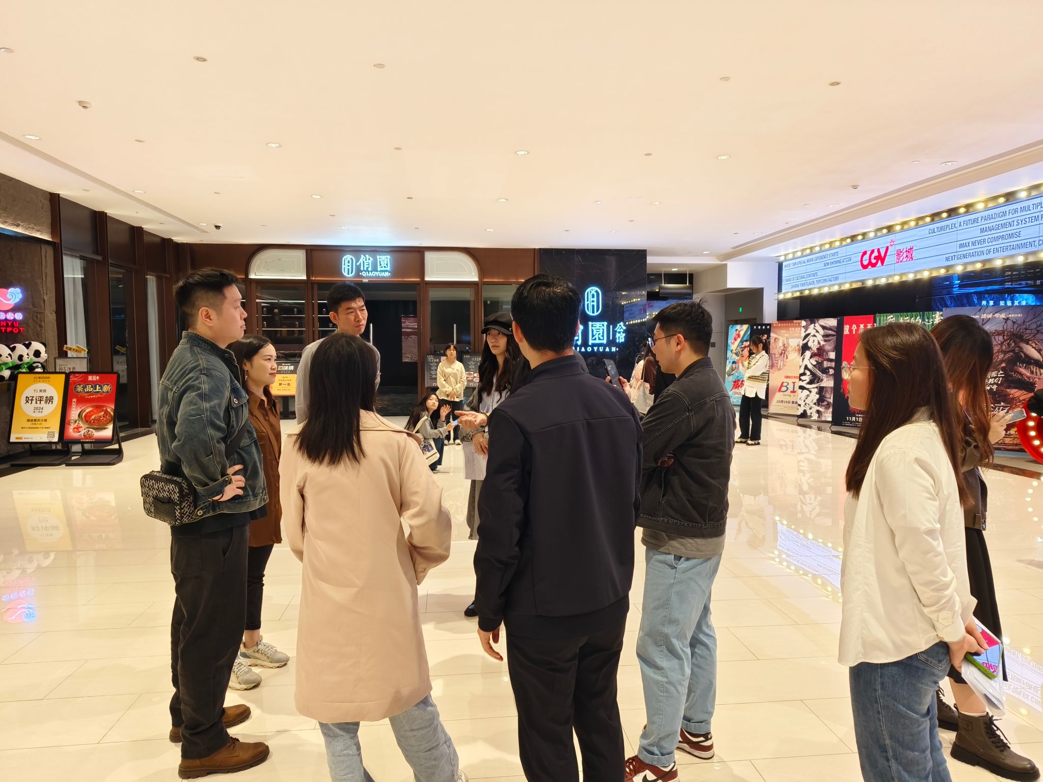 13:40,项目成员们抵达朝天门来福士广场,进行了简短的集合和注意事项宣讲。随后,成员乘坐车前往CGV来福士影城。在14:00至14:30的时间里,成员们参观了影城,并详细了解了特殊影厅的放映技术,以及特效片的试看体验。