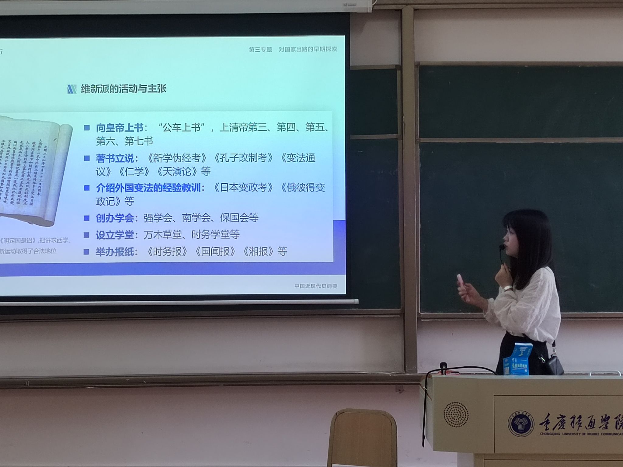 杨佳欣老师围绕《中国近现代史纲要》第二章第三节 “资产阶级改良派的维新变法梦为何落空?”这一主题展开授课。她以一个引人深思的问题 ——“资产阶级维新派为何未能成功推动变法?”作为切入点,通过设问式导入,激发学生对维新变法背景及失败原因展开深入思考。