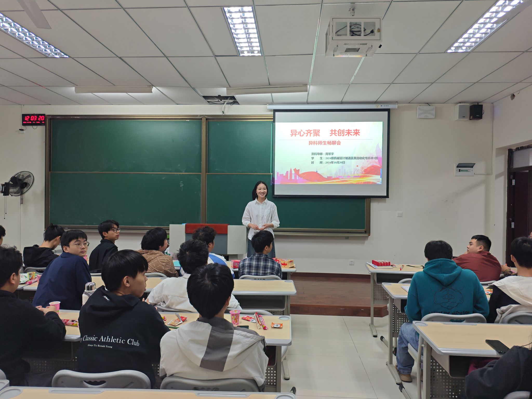 异科导师周琴宇与2024级机械设计制造及其自动化专升本9班共31位同学于双栀109教室开展了“异心齐聚 共创未来“的异科师生畅聊会,同时也是周老师与该班学生的首次见面会。