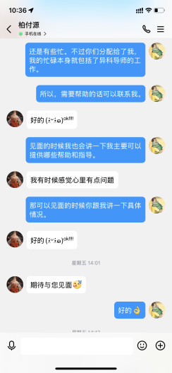 异科导师黄艳与柏付源同学进行了一对一谈话,柏付源历经2年白血病斗争,赞扬了柏同学坚强的意志力,鼓励他恢复健康的同时保证学业。