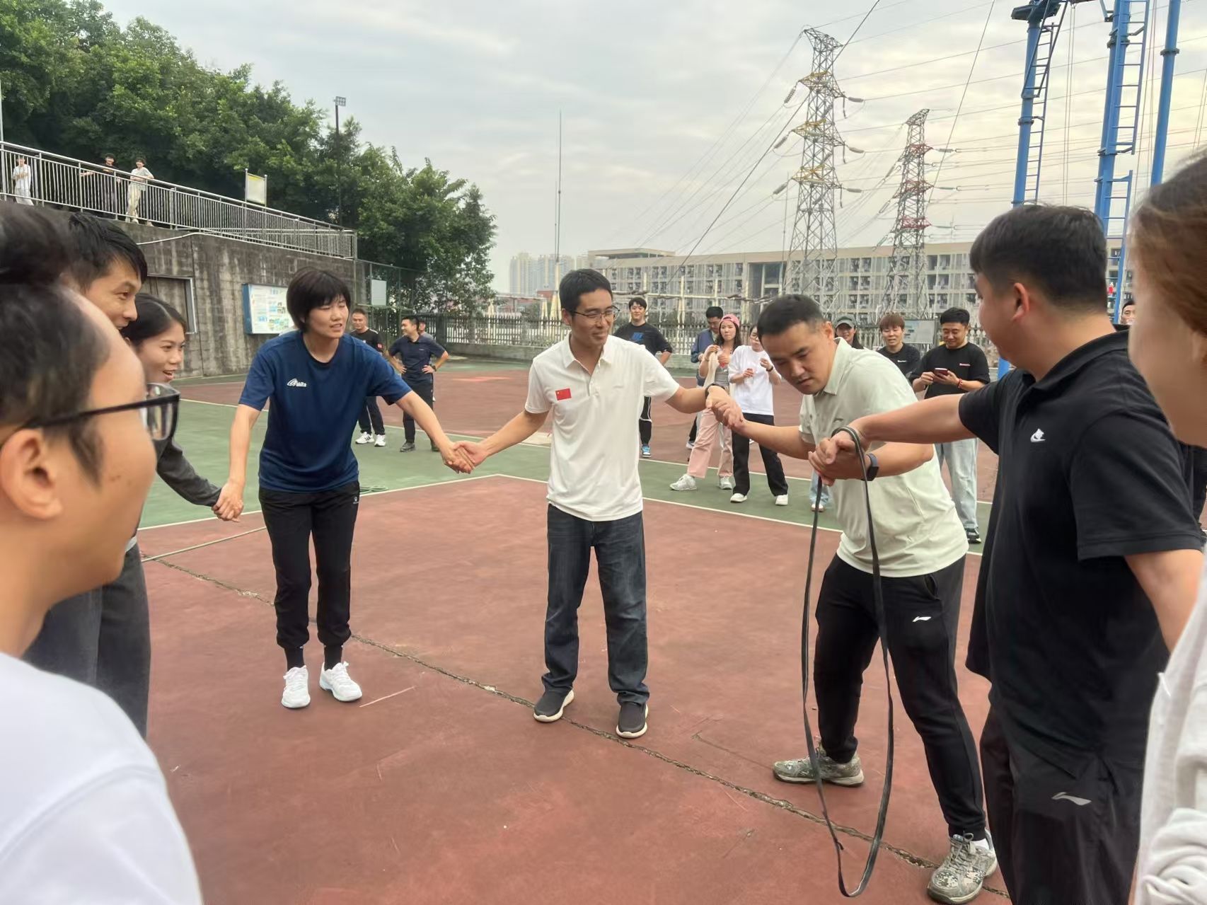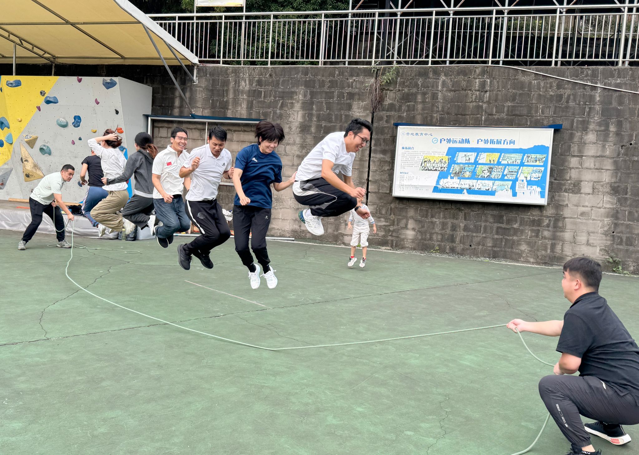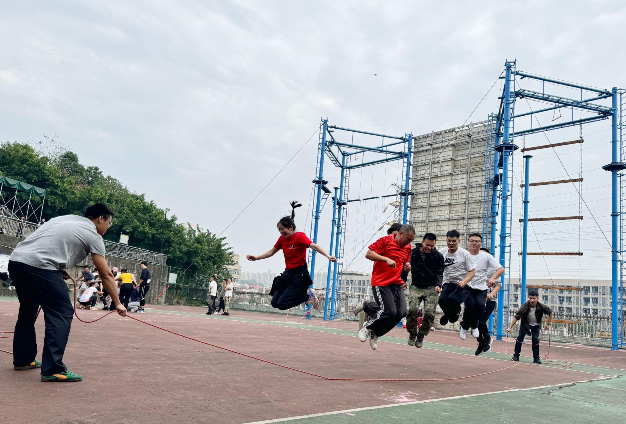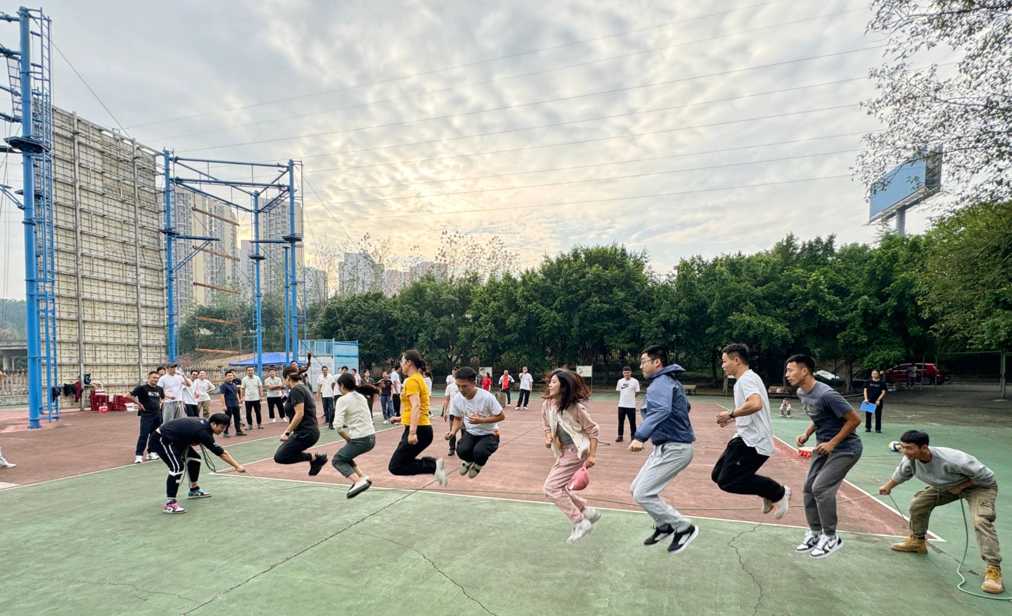 团建活动正式开始,第一个比拼项目是大河之舞。教师们排成队伍,伴随着两边队友的摇绳节奏连续跳动,如同一条巨龙翩翩起舞。他们的姿态优雅,步伐矫健,仿佛把人们带入了壮阔的江河之中。每个人都在尽情地挥洒着汗水与热情,释放着内心的激情与活力。