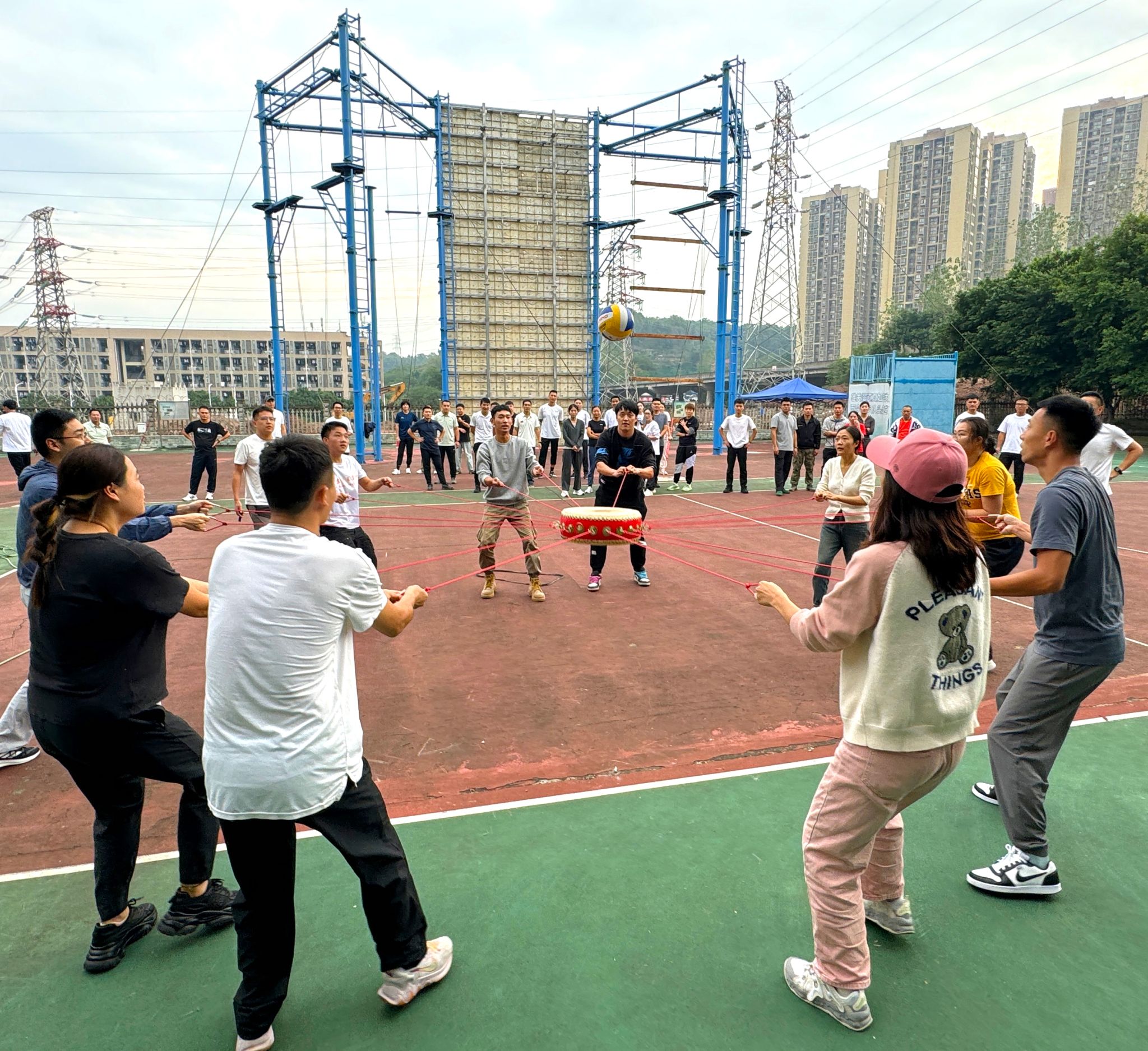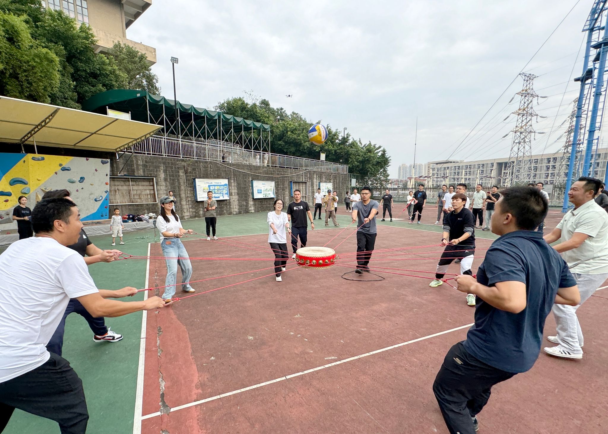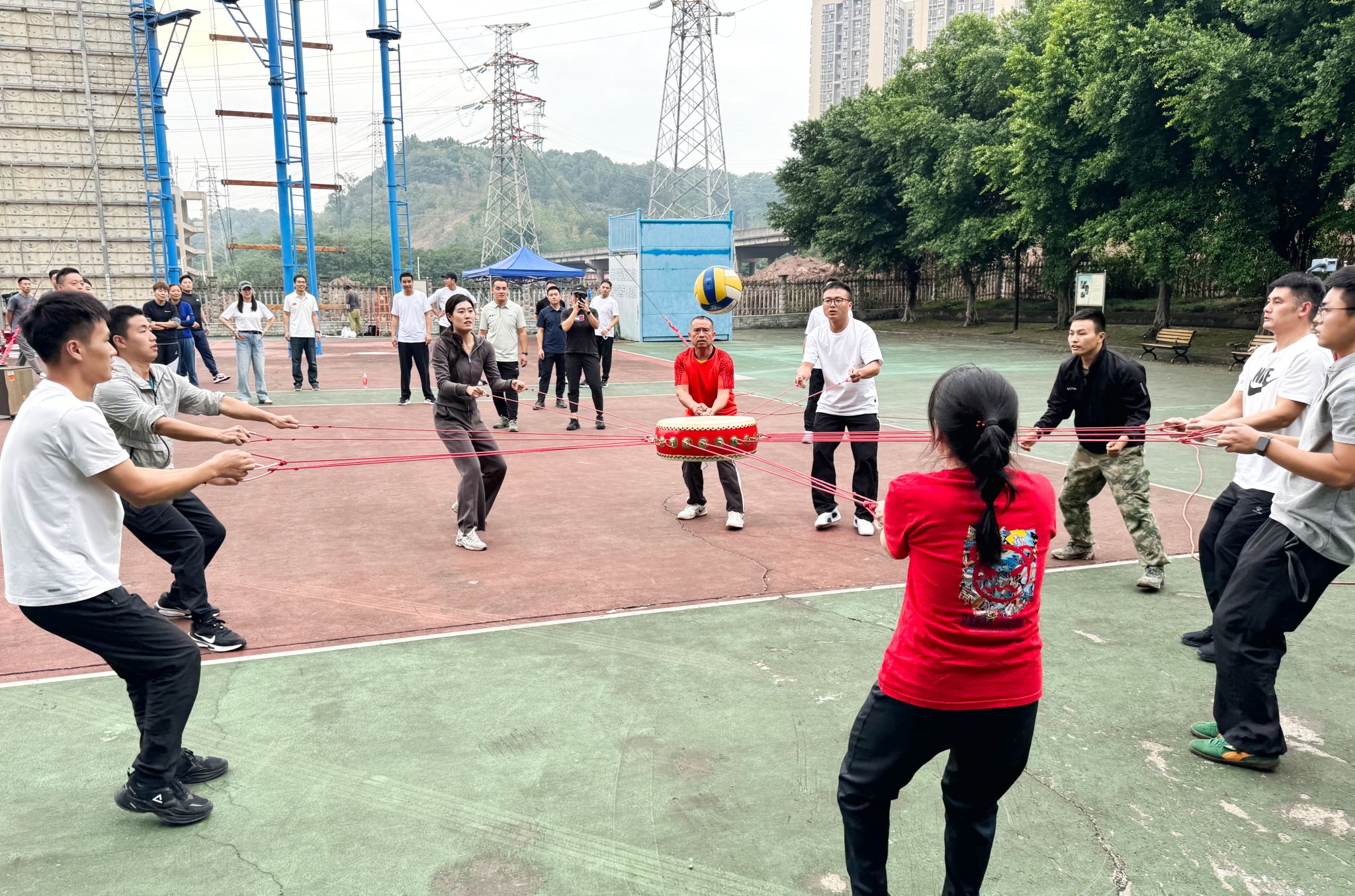 紧接着是精彩的击鼓颠球,还有的名称叫同心鼓和鼓舞人心。老师们围站成一圈,手握连接中心鼓的长绳,随着统一的节奏,不断将球颠起。球在鼓面上跳跃,每一次的颠起都凝聚了教师们的智慧和力量。他们默契配合,互相鼓励,共同为团队争取更高的分数。