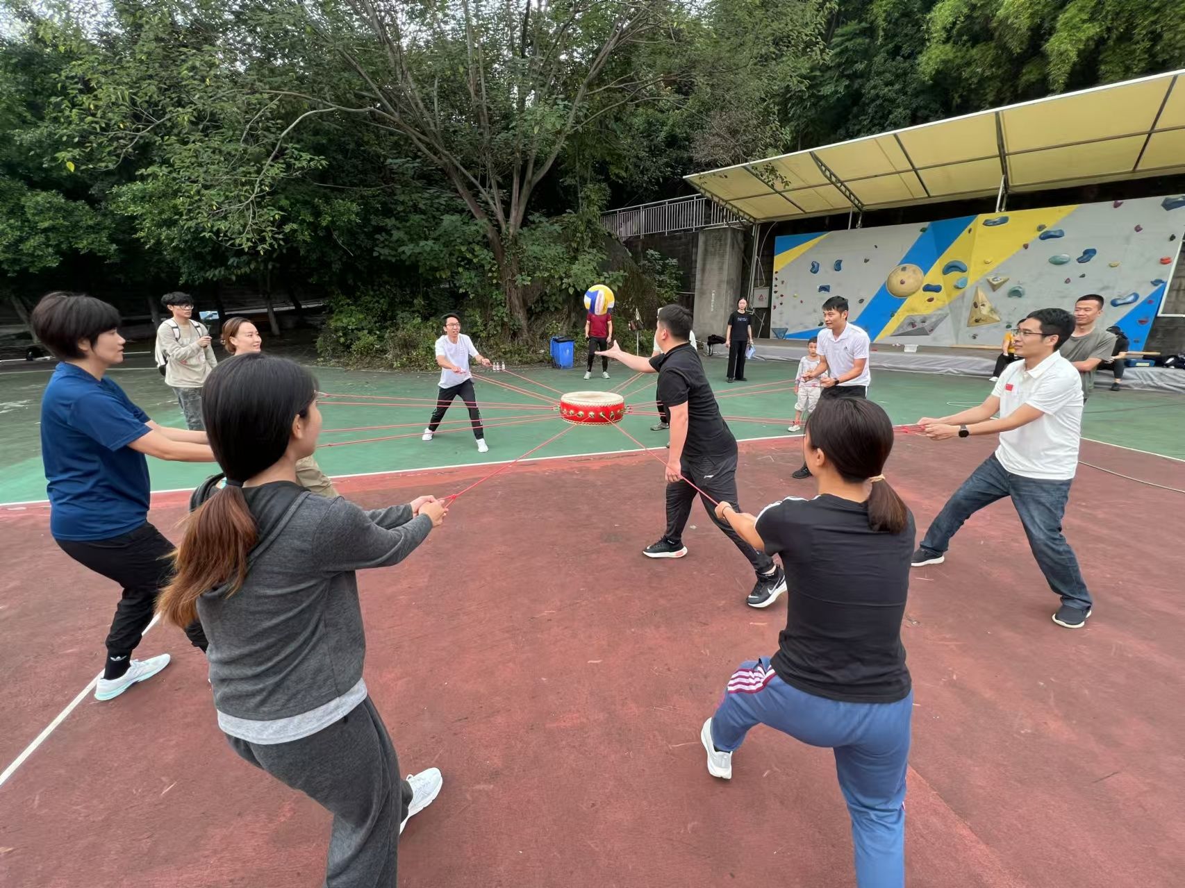 全体教职工在拓展训练基地集合,随机分队进行接下来的比拼活动。比拼活动由营地教育中心的雷忠林组长、程光涛组长负责整体策划,李华龙教练和张雪如教练进行破冰分组和裁判执行。本次活动将通过击鼓颠球、大河之舞、穿越时空、激情节拍四个小项目的挑战,检验团队的协作与默契,总用时短的团队将获得胜利。