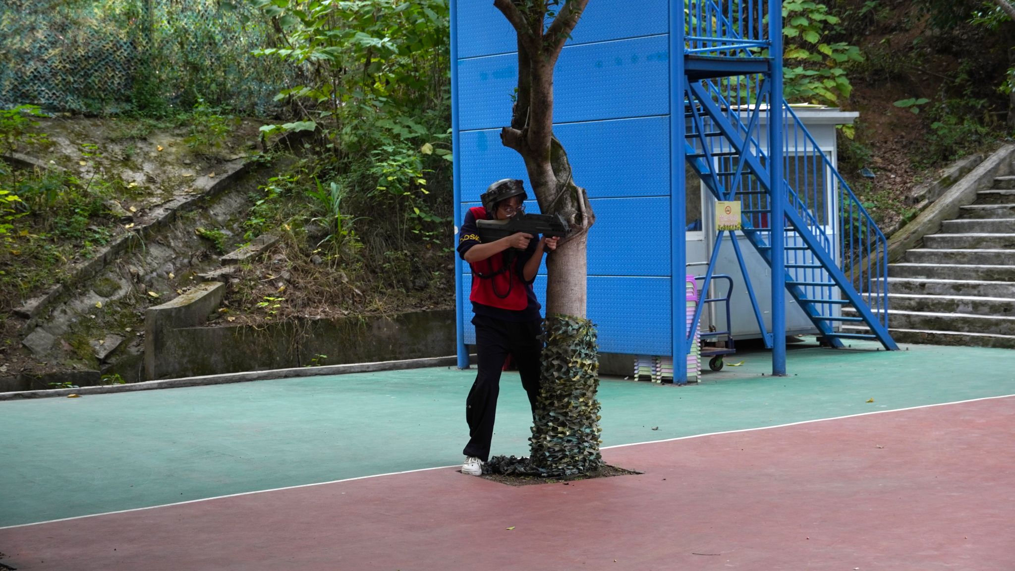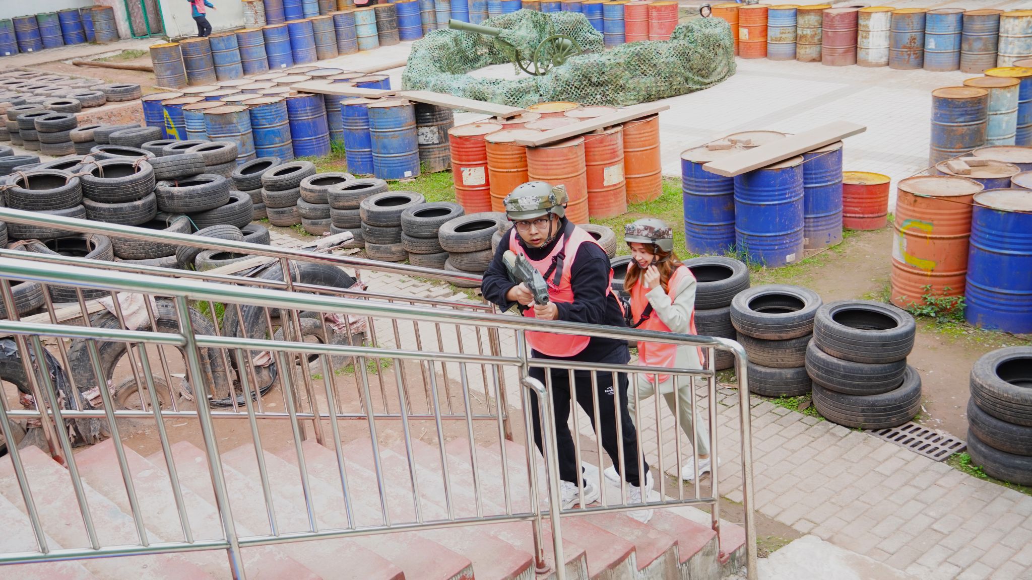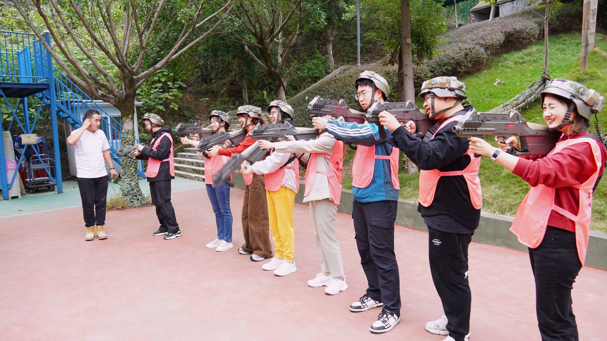 工作全力以赴,团建热情奔赴。活动伊始,营地教练们带领全体教职工做赛前热身,调动起大家沉睡已久的运动细胞,老师们身着运动服装,蓄势待发。待营地教练为大家分好组、详细讲解游戏规则后,一场沉浸式真人CS正式开始,大家穿上装备,穿越到游戏世界。每一次躲避和“击杀”,每一次紧张刺激的对战,都展现出三支队伍高超的战术素养和团队协作精神,每一次成功的进攻与防守都伴随着队员之间的默契配合与相互鼓励。在激烈的对抗中,大家释放了情绪,锻炼了体魄,不仅体验到了军事竞技的紧张刺激,更深刻感受到了团队合作的重要性。
