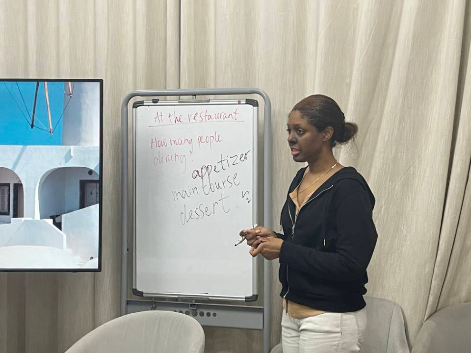 活动伊始,外教Kris通过模拟餐厅场景作为切入点,引出了本次活动的主题——“At the restaurant”。通过情景式模拟引导同学们用英语开始了一场 “餐厅对话”。同学们充分发挥了自己的想象力和创造力,不仅讨论了点餐、询问菜品口味、推荐特色菜等常规话题,还融入了询问餐厅优惠活动、提出特殊要求等更加贴近实际生活的元素。并且外教Kris针对同学们的英语表达,给予了耐心指导,纠正发音错误,并教授了一些地道的英语表达方式。在讨论过程中,同学们提高了英语口语水平。