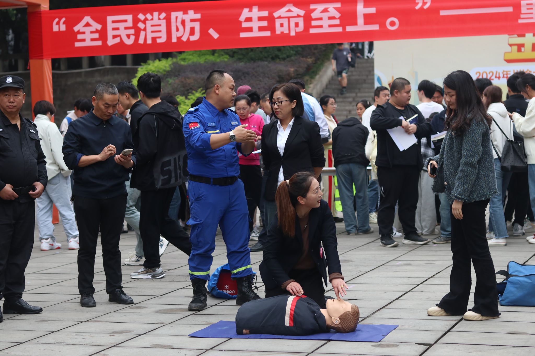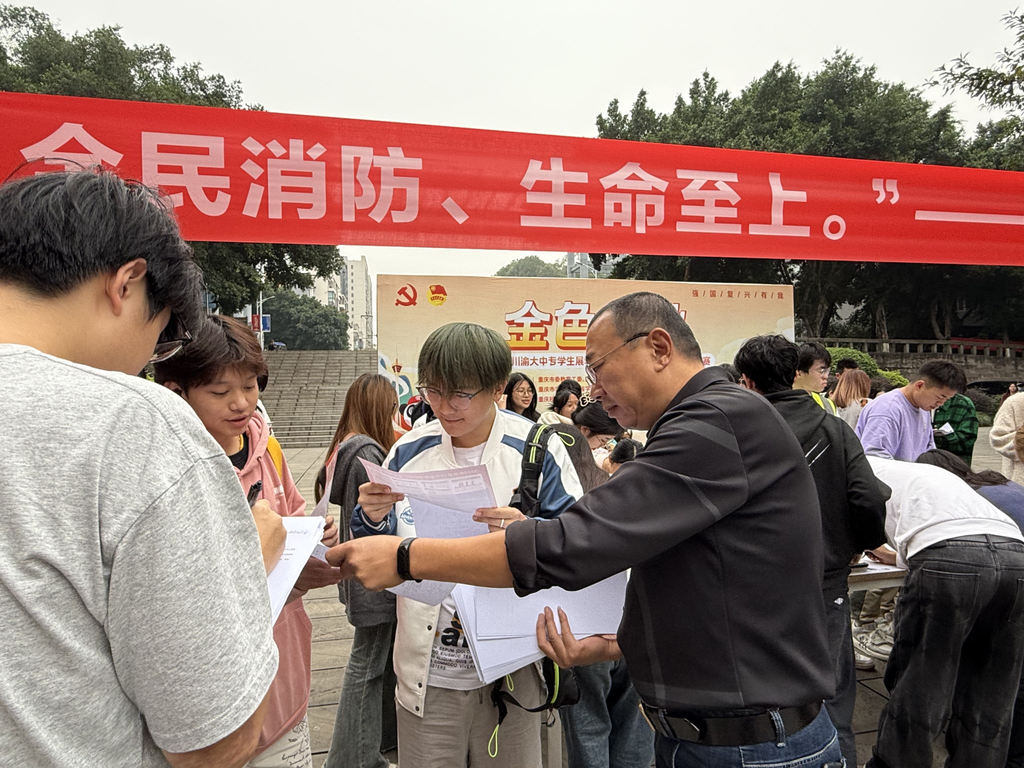 为夯实学校消防工作,提高校师生防火意识,由重庆移通学院合川校区保卫处与学生处宿舍管理中心联合举办的“全民消防、生命至上”119消防宣传月活动于2024年11月7日下午15:30在黄桷树广场开展。此次活动旨在通过有奖问卷调研、普及应急救护知识与现场灭火实战体验等活动,提高全校师生的消防安全意识,确保在遇到火灾时能够迅速有序地进行自救与互救。
