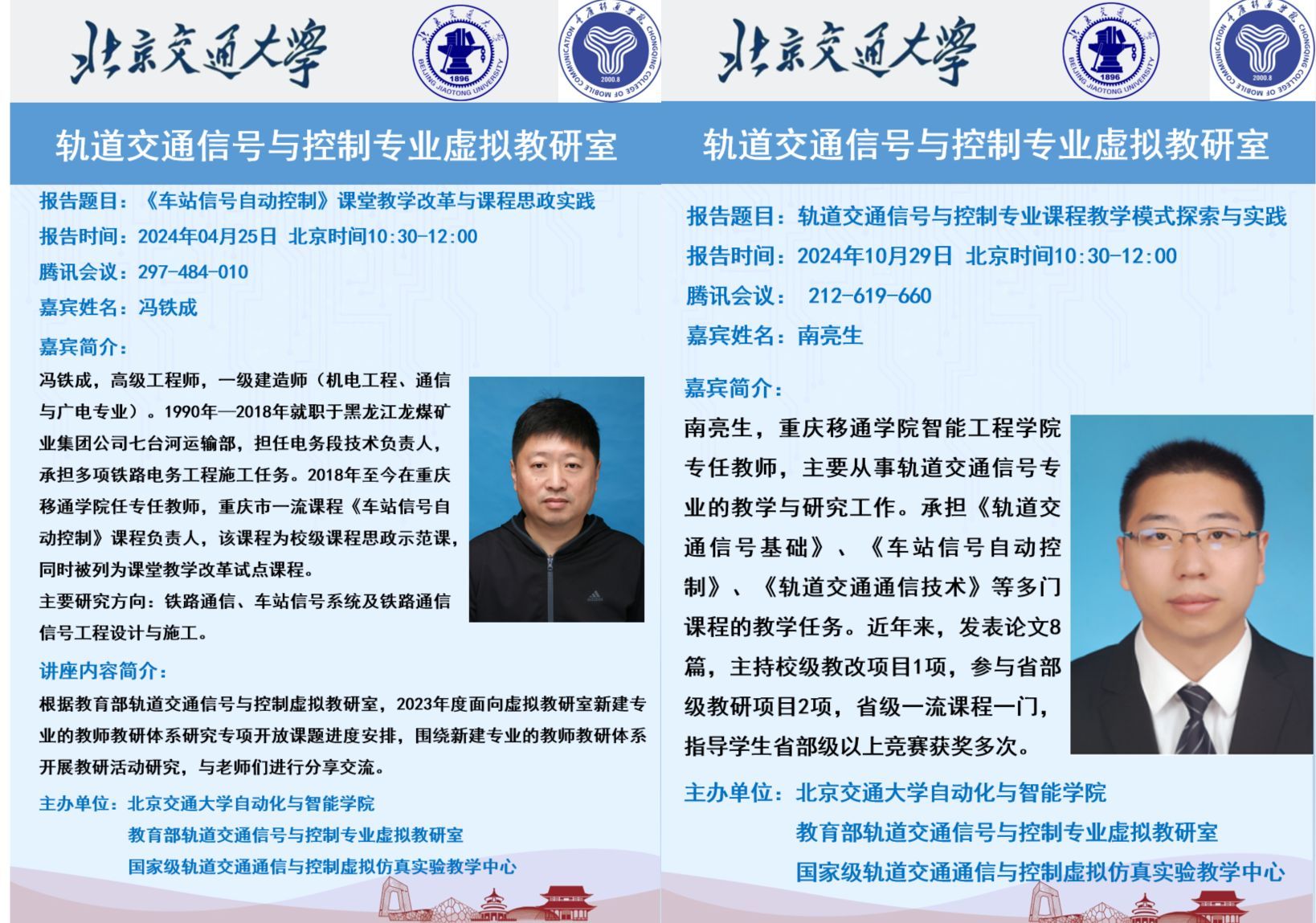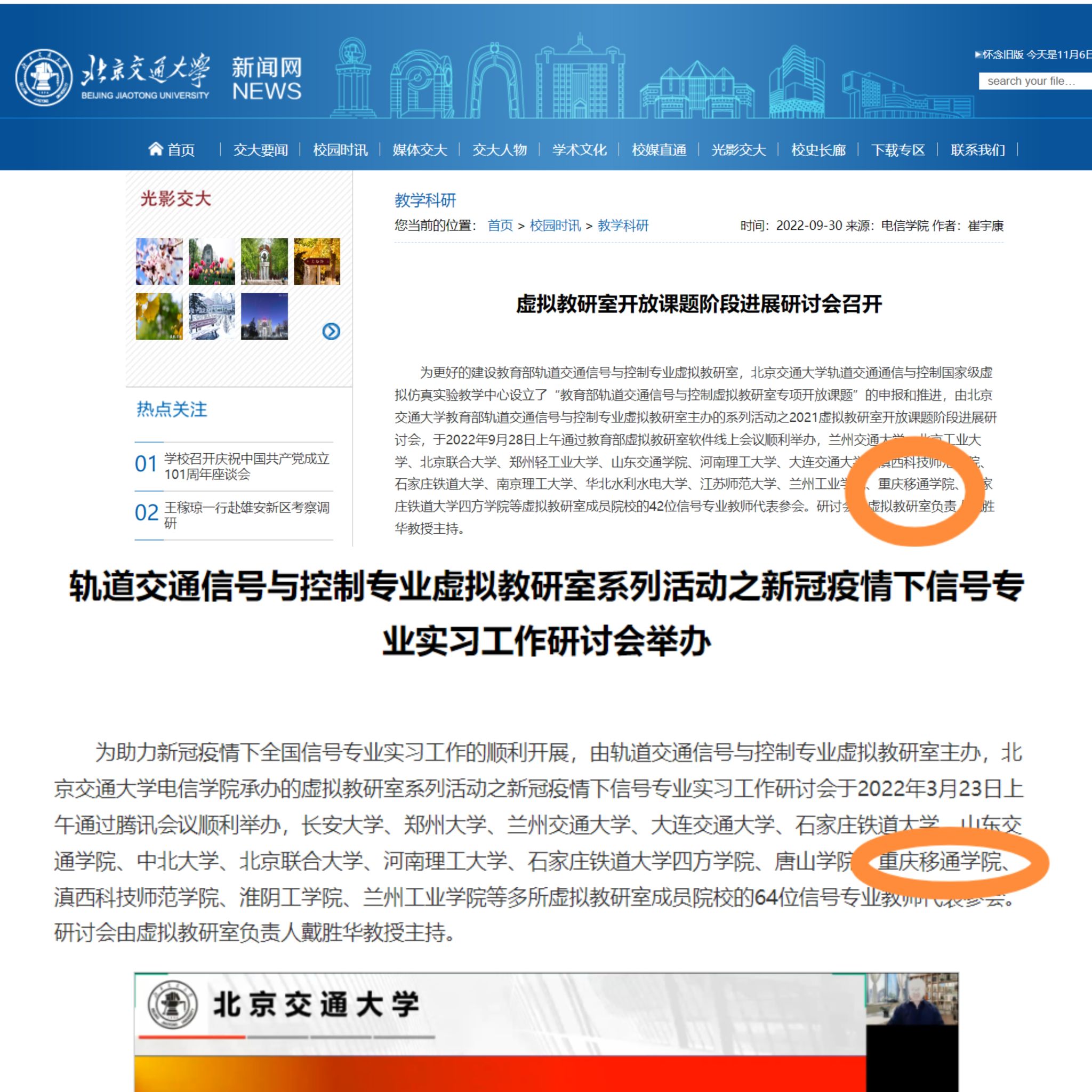 他山之石,可以攻玉。我校轨道交通信号与控制专业积极投身于虚拟教研室组织的各项工作,包括专业课程建设、人才培养方案优化、资源共享、教学研究、教师培训、电脑鼠竞赛以及共享研究成果等,为专业发展注入源源不断的动力。 依托虚拟教研室资源,在课程建设方面也取得了一些突破。2022年,《车站信号自动控制》被认定为校级一流课程、课程思政示范课。2023年,该课程更进一步,被认定为重庆市一流课程,实现了以课程建设推动专业发展的良好局面。同时,北京交通大学轨道交通通信与控制国家级虚拟仿真实验教学中心设立了 “教育部轨道交通信号与控制虚拟教研室专项开放课题” 申报项目,我校先后申报了“基于虚实融合模式的轨道交通信号与控制专业实践课混合式教学方法探索”和“‘AI + 虚拟教研室’模式下的信号专业课程改革实施路径探索”两项极具价值的教研课题。2024年,智能交通教研室冯铁成、南亮生老师还在虚拟教研室平台上进行了 “车站信号自动控制课堂教学改革与课程思政实践”和“轨道交通信号与控制专业课程教学模式探索与实践”的经验分享,如同在专业发展的画卷上添上了浓墨重彩的一笔。