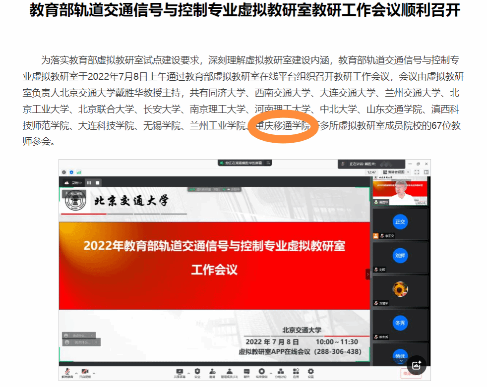 2020年初,新冠疫情突如其来,如同一团阴霾笼罩大地。然而,虚拟教研室在这艰难时刻恰似一阵春风,展现出了强大的韧性和独特的价值。它为各成员单位搭建起了疫情期间实习实践平台、优化人才培养方案、共享资源、开展教学研究、组织教师培训以及分享研究成果等工作的交流合作平台,成为特殊时期教育领域的中流砥柱,促进了各地高校的专业发展。凭借卓越的表现,2022年成功入选教育部第二批虚拟教研室建设试点名单。2022年以来,虚拟教研室融合多元现代信息技术和线下交流互访机制,精心“协作”开展了一系列丰富多彩的“互联网 +”与“智能 +”虚拟教研活动,涵盖教学研讨会、课程思政建设、专题报告会、学生学科竞赛等多种形式。无论是关乎该专业人才培养方案的宏观规划,还是某个知识点在课堂讲授中的微观技巧,在虚拟教研室这个充满智慧的空间里,都能找到答案。教师们在这里实现了实时对话和深入探讨,如同在云端构建了一座教育智慧的殿堂。 如今,北京交通大学全国轨道交通信号与控制专业虚拟教研室已经覆盖全国48所开设信号专业并招生的高等院校。