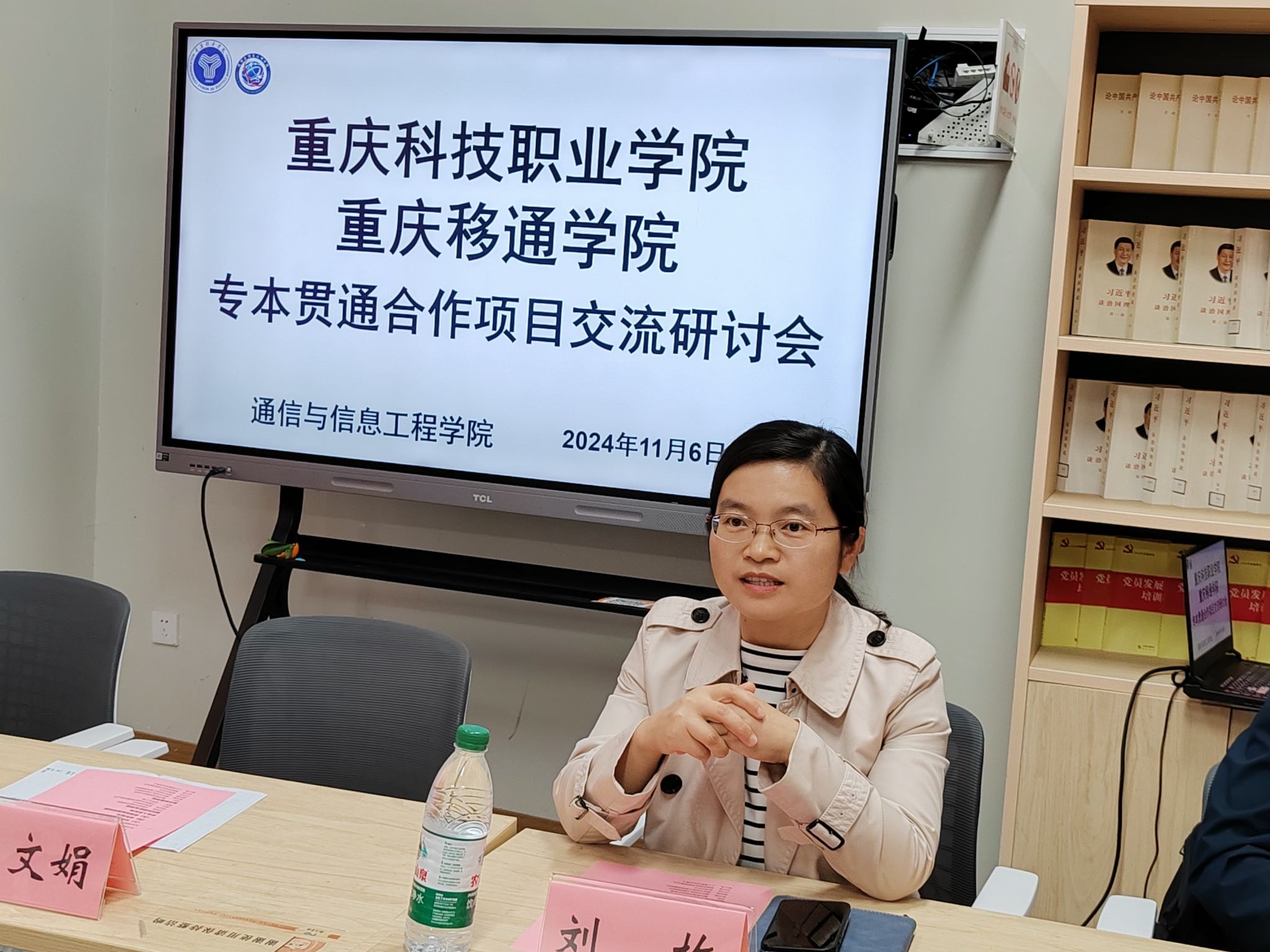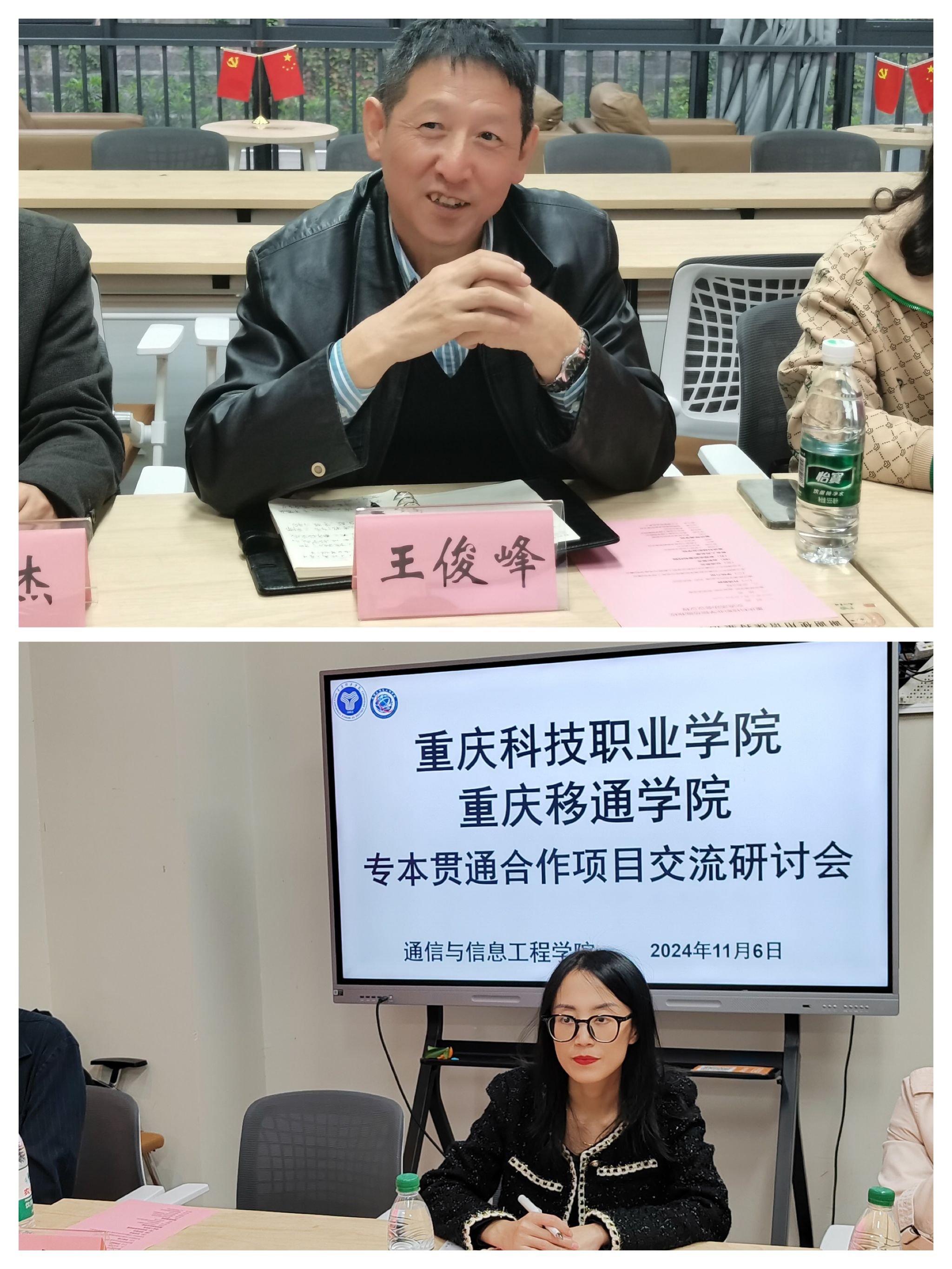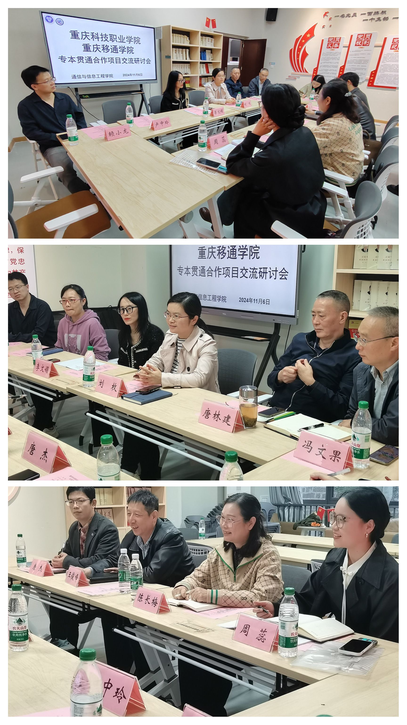 为深化两校之间的教育合作并推进专本贯通合作项目的顺利进行,11月6日下午4点,重庆科技职业学院与重庆移通学院在南湖书院党团活动室举行了一场交流研讨会。此次会议聚焦于如何更好地实现学生从专科阶段到本科阶段的平稳过渡和无缝衔接。参与此次会议的嘉宾有重庆科技职业学院教务处副处长陈长梅、大数据与信息学院院长王俊峰、大数据与信息学院教研室主任唐杰及教务处干事周蕊;重庆移通学院校长助理刘枚、教务科科长卢中玲、通信与信息工程学院院长李文娟、副院长唐林建、智能信息技术教研室主任冯文果以及人工智能专业负责人赖小龙等六位领导与教师共同出席。