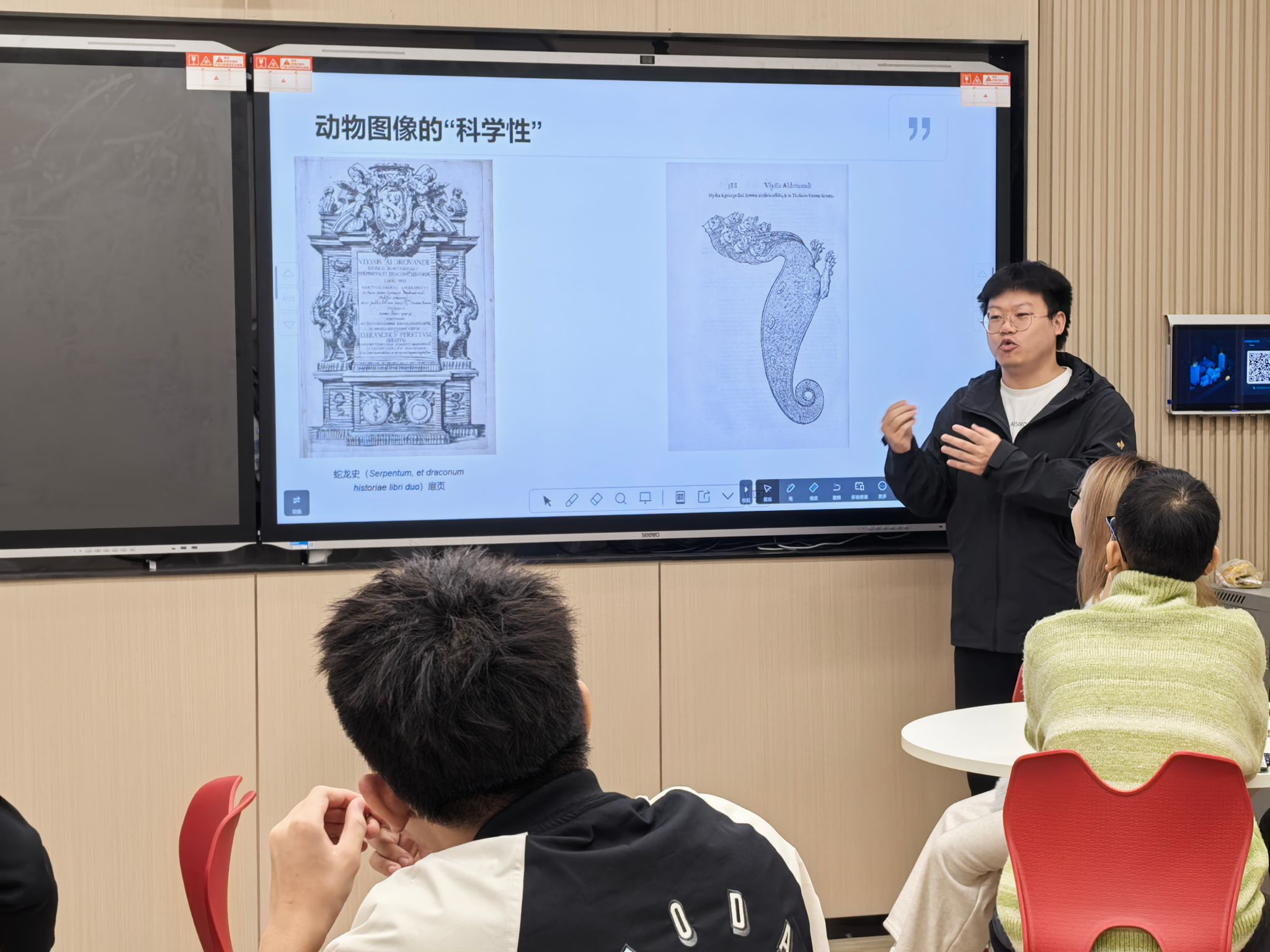 在讲座的开篇,陈老师用鲜活的案例细致地解读了科学动物图像的演变。那些自中世纪起便在科普书籍中出现的插画作品,宛如一扇穿越时空的魔窗,引领同学们领略了历史上的科学与艺术交融之美,激发了他们对这些奇妙动物图像的极大兴趣。继而,陈老师深入浅出地阐述了欧亚大陆上动物图像的传统特色,从西方到东方,东西方动物图像的地域风貌在同学们面前依次展开,犹如一幅斑斓多姿的画卷,极大地激发了他们的创新灵感。