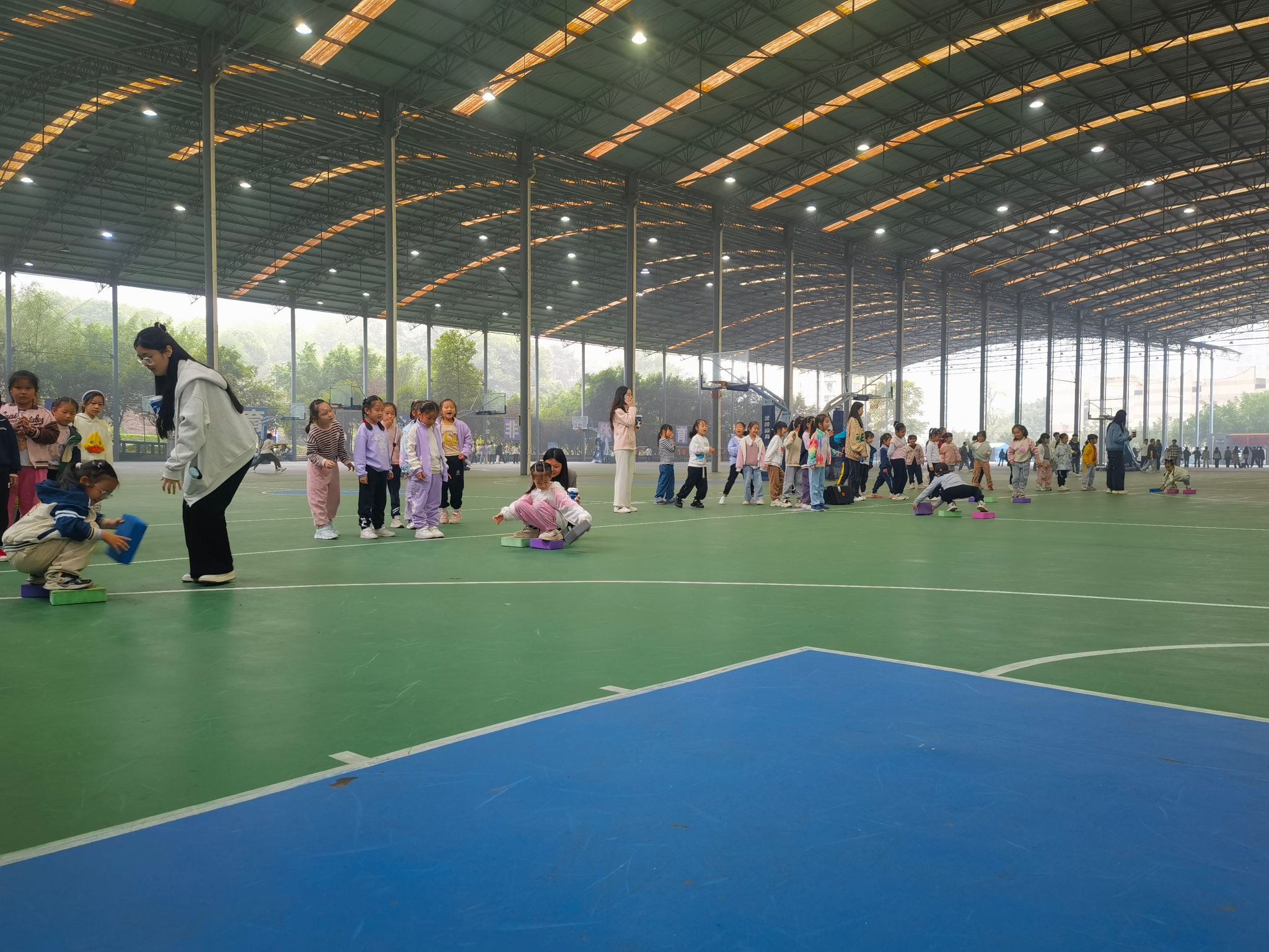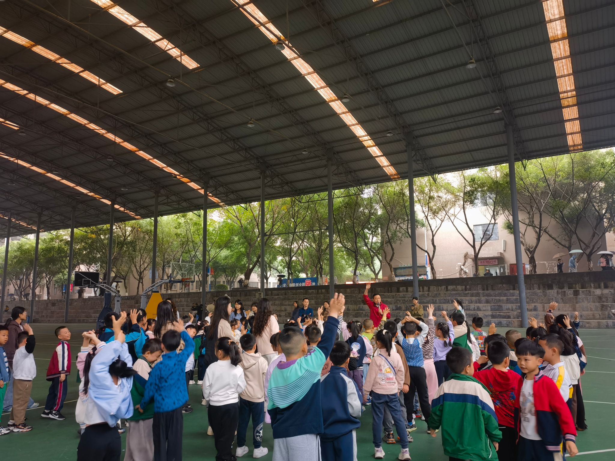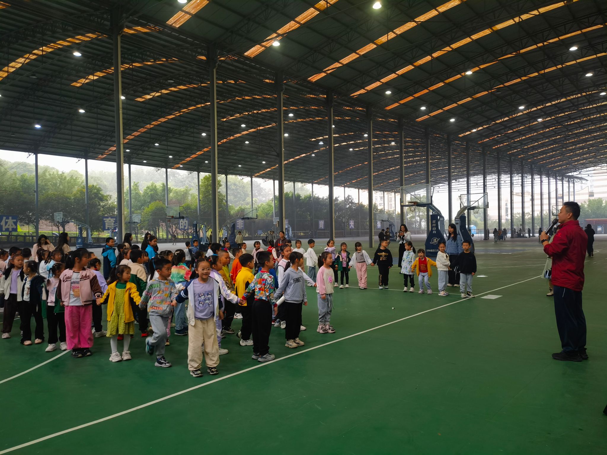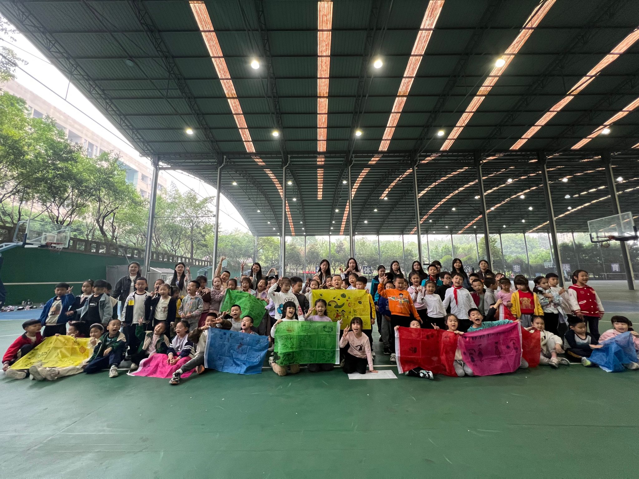 在重庆移通学院和新华小学老师们的带领下,小朋友们在9点30分参观到了风雨球场,并开始了一系列充满乐趣与挑战的活动。