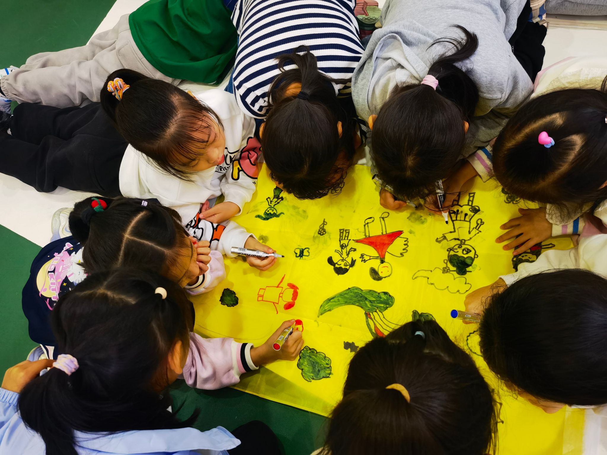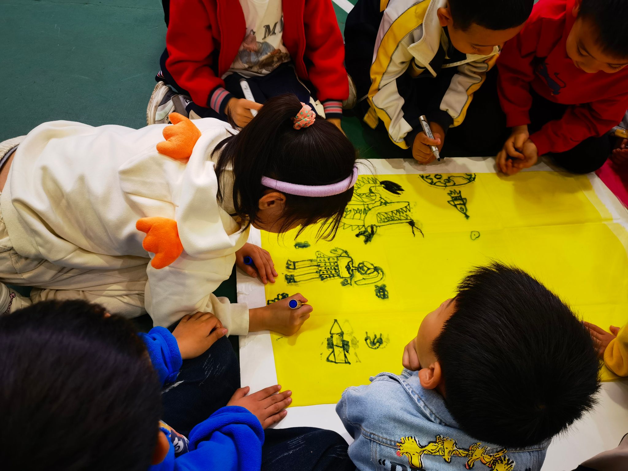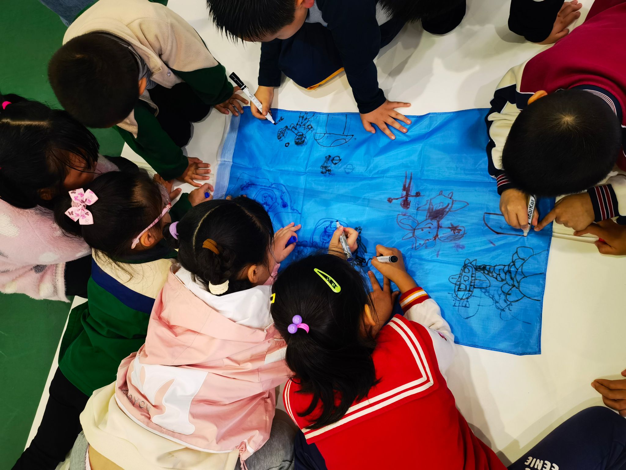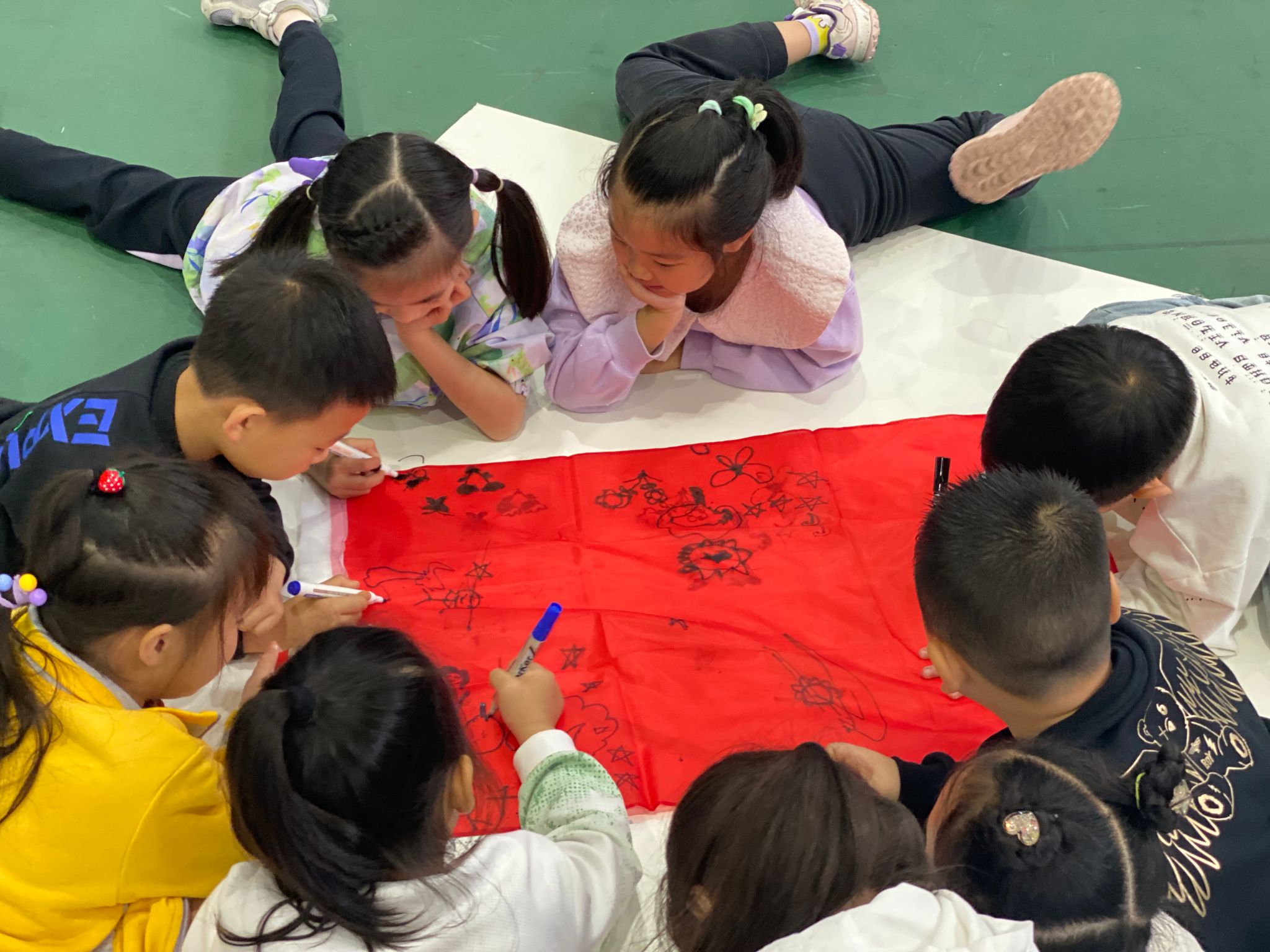 活动开始,营地教育中心李华龙教练首先与小朋友们对了“暗号”—“hello!”、“hi!”,在一声声响亮的回答声中,小朋友们站好了队伍,期待着第一个游戏—兔子舞。小朋友们手拉手,“前前、后后、左左、右右”,他们开心地跳着,整齐的声音充满了整个风雨球场。随后,在教练的安排下,小朋友们按照分好的小组围成一圈,他们发挥创意,十分投入地趴在泡沫板上,用五颜六色的旗帜和笔绘出了各自心中的美丽“梦想”。