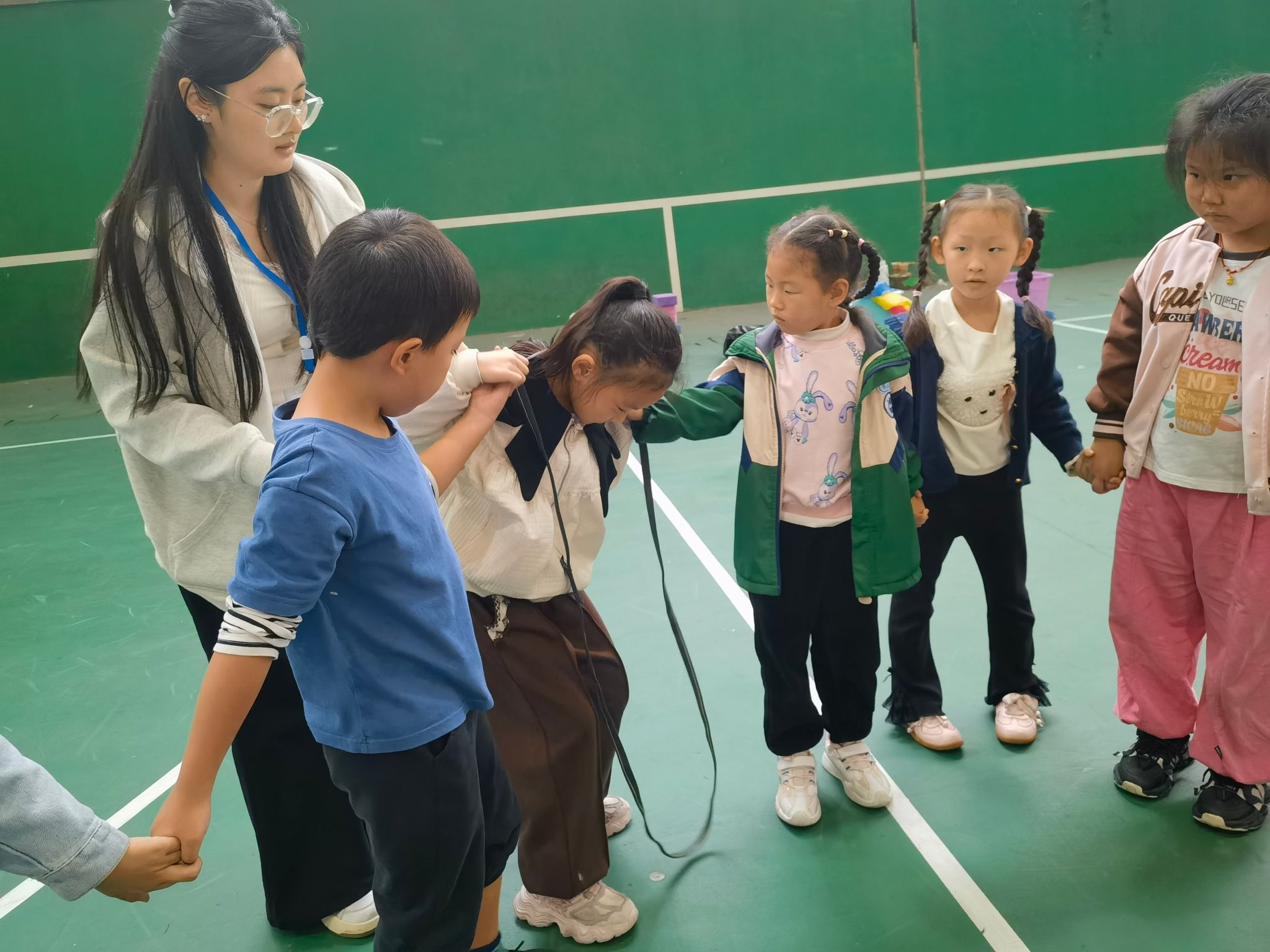 最后一个游戏,叫做“穿越时空”,由营地教育中心叶厚教练带领着小朋友们挑战。这需要小朋友们以小组为单位手拉手不松开,让中间的绳圈套过每个人的身体。在几分钟练习时间后,挑战开始了,小朋友们互帮互助,我帮你,你帮我,共同完成了最后一个挑战。