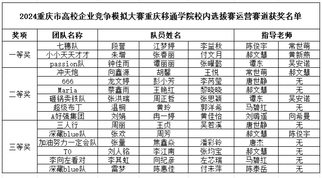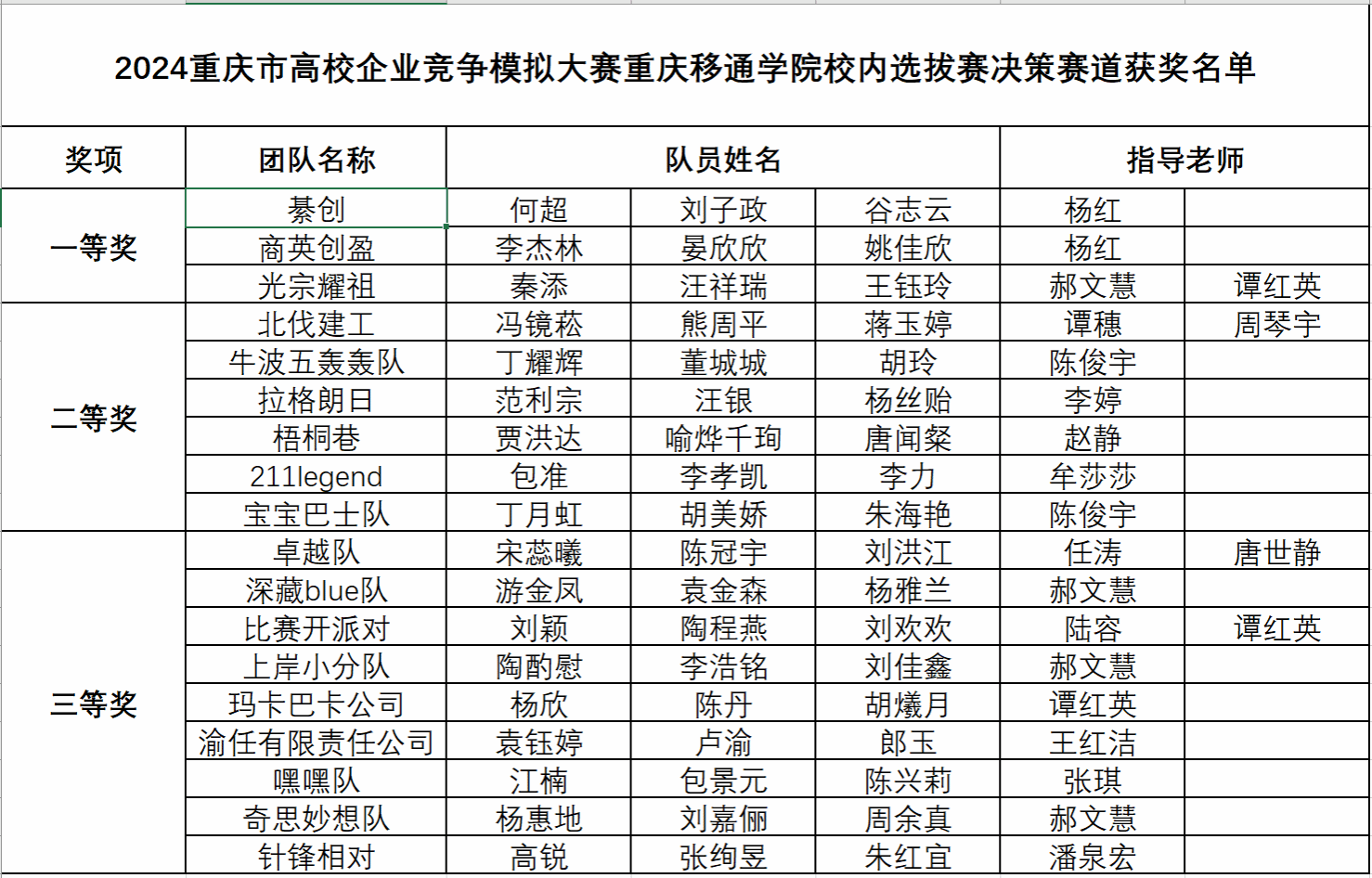 最后,祝贺所有获奖的队伍和个人,感谢所有参与本次比赛的选手、指导老师和工作人员。让我们期待他们在接下来的重庆市高校企业竞争模拟大赛复赛和决赛中,再创佳绩!