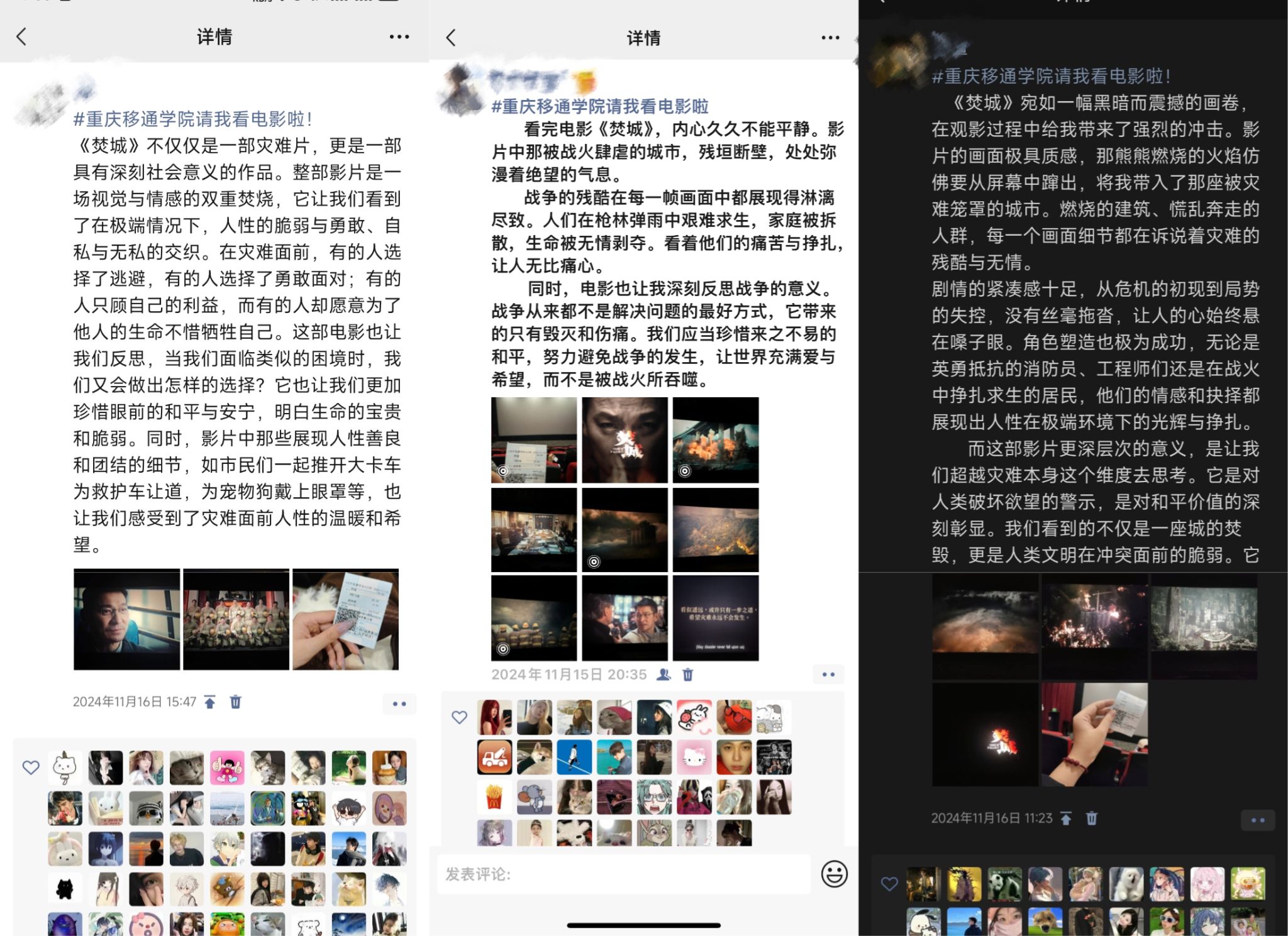 “筑梦青春·影励前行”观影活动,不仅丰富了学生的课余文化生活,更重要的是在潜移默化中塑造了他们积极向上的人生态度和强烈的社会责任感。未来,学生处将继续探索更多类型的影片,如励志、历史、科幻等,以多元化的视角和丰富的题材,为学生提供更加全面的精神滋养,助力他们在成长的道路上更加坚定、自信地前行,为推动社会进步贡