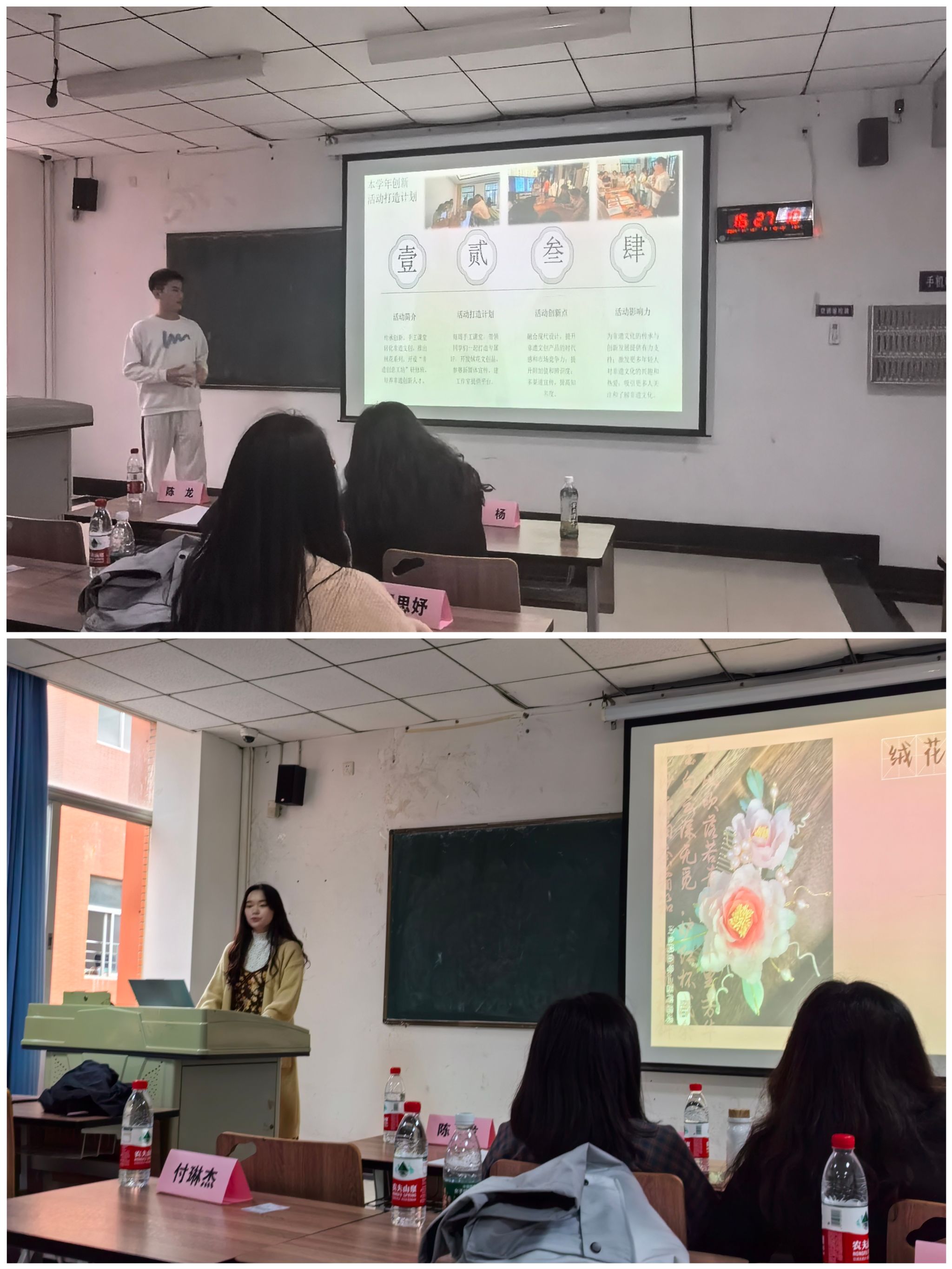交流会伊始,重庆移通学院的李佳伟同学以“传承经典,共话未来”为主题,进行了精彩的汇报。他通过大量详实的数据和活动分析,展示了课程在非物质文化遗产保护、传承与发展方面取得的卓越研究成果。随后,周思妤同学为在场师生介绍并展示了精美的非遗绒花作品,其精湛的技艺和独特的创意赢得了大家的阵阵掌声。四川师范大学的吴超明教授对两位同学的汇报给予了高度评价,并指出在传统文化的发展过程中,应注重其深层的文化内涵与修养,以更好地传承和弘扬中华优秀传统文化。