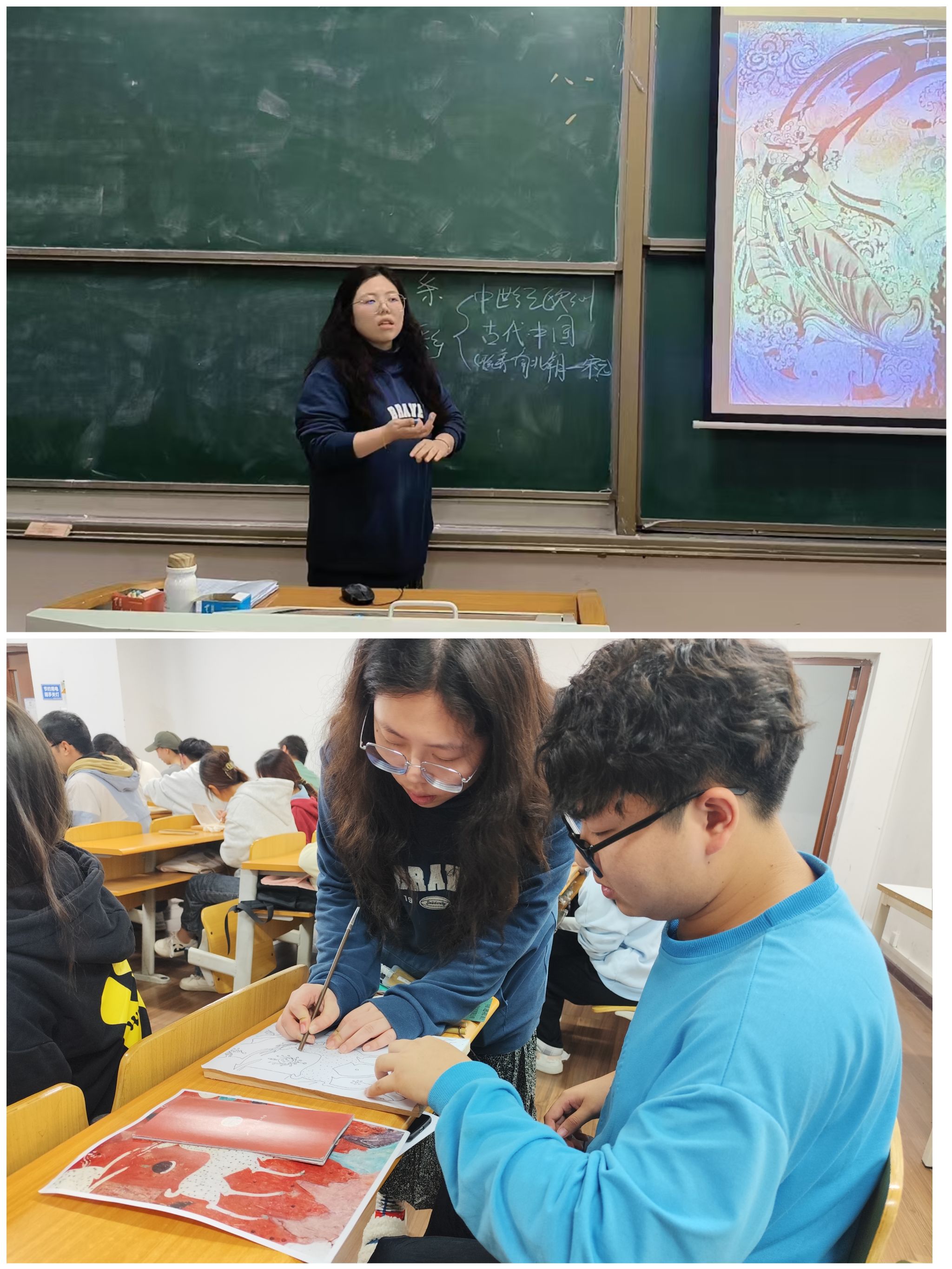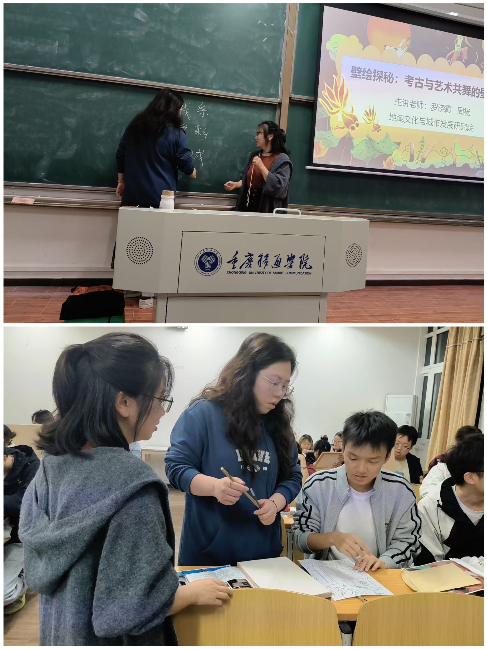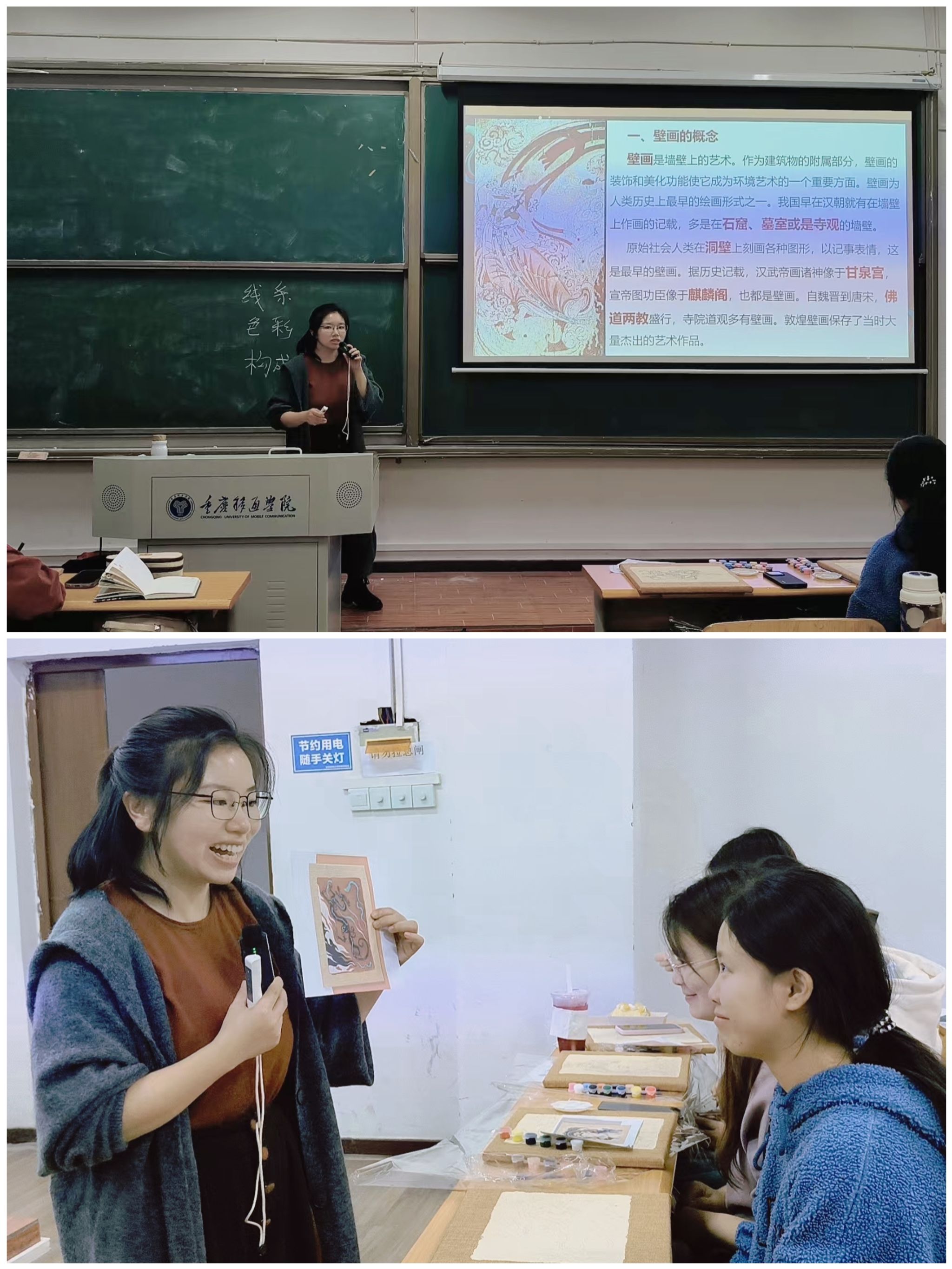 为了给学生提供更为全面、深入的壁画知识与实践体验。11月4日,地域文化与城市发展研究院讲授《博物馆里的中国》的罗晓霞老师和讲授《非遗手工创新设计》的周杨老师,在7202教室开展了一堂“理论+实践”的双师授课。本次授课以《壁绘探秘:考古与艺术共舞的壁画世界》为主题,旨在通过深入挖掘壁画的考古与艺术价值,促进传统文化的传承与创新,拓宽学生学术视野,激发艺术创作热情。