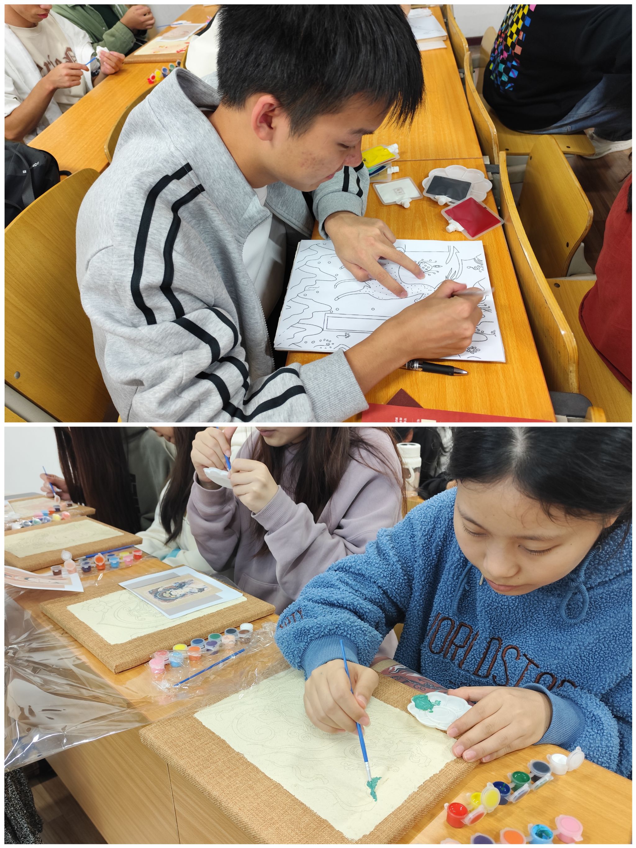 在两位老师的精彩讲授之后,授课活动进入了实践环节。学生们在罗晓霞和周杨两位老师的指导下,纷纷拿起画笔,开始了自己的壁画创作。两位老师耐心指导,不时为学生们答疑解惑,整个课堂氛围热烈而有序。