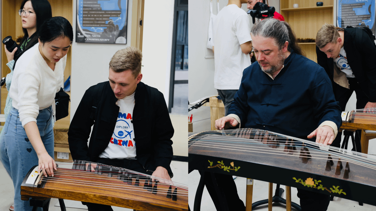 接着,德国学生们有机会亲手触摸并体验了各种中国传统兵器,这些兵器背后蕴含的历史和战术知识让他们对中国的军事文化产生了浓厚的兴趣。在充满古韵的中华传习室,德国师生一起聆听了中国传统古筝的演奏,学生们对这种古老乐器的音色和演奏技巧感到惊叹,他们也在老师的指导下尝试演奏了几首简单的曲目,体验了音乐与文化的交融。