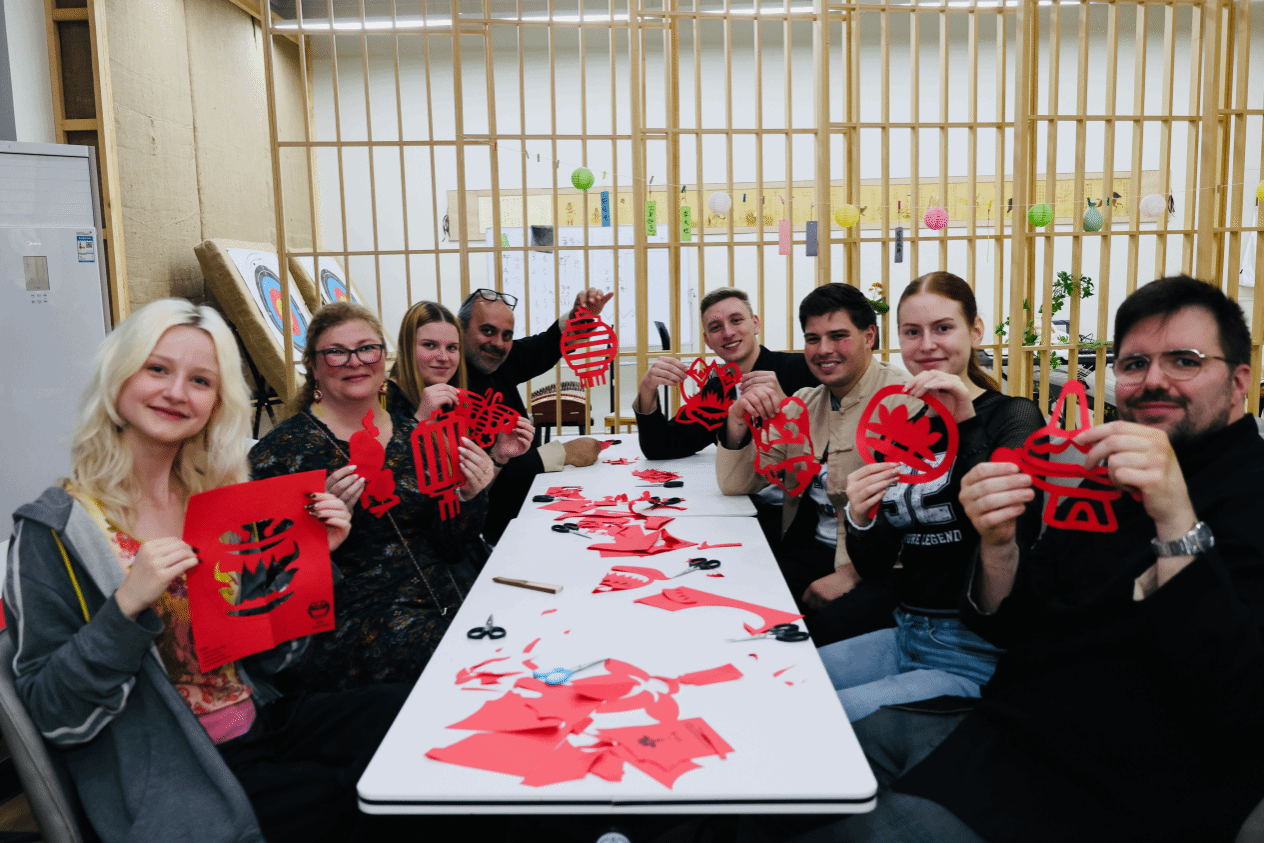 茶艺表演更是让德国学生们大开眼界,他们认真观赏茶艺社团同学们行云流水的动作,学习茶道文化,并亲自品尝了传统中国茶的风味,感受到了茶文化中的宁静与和谐。此外,他们还体验了学习中国传统剪纸技艺,在同学们的指导下,大家都剪出了精美生动的剪纸作品,这门精细的艺术让他们对中国民间艺术的精湛技艺和文化内涵有了更深刻的理解。