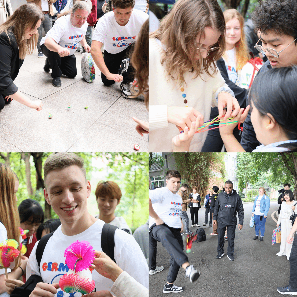 欢迎仪式结束后,德国游学团的学生们在热情的引导下,开始了对南湖书院及校园的探索之旅。一路上,精心设置的游戏互动点让整个参观过程妙趣横生。在石头剪刀布的游戏中,中德学生笑声不断;翻绳游戏则展现了大家的心灵手巧;夹弹珠环节更是紧张刺激,学生们全神贯注,争分夺秒。阳光普照,校园内洋溢着活力与文化的魅力,为这场文化交流活动增添了无限生机。中午中德两国学生齐聚学校食堂,共进午餐,品尝中国美食,亲身体验丰富多彩的校园生活。食堂里,大家边品尝美味的饭菜,边交流着彼此的校园故事,欢声笑语回荡在空气中。