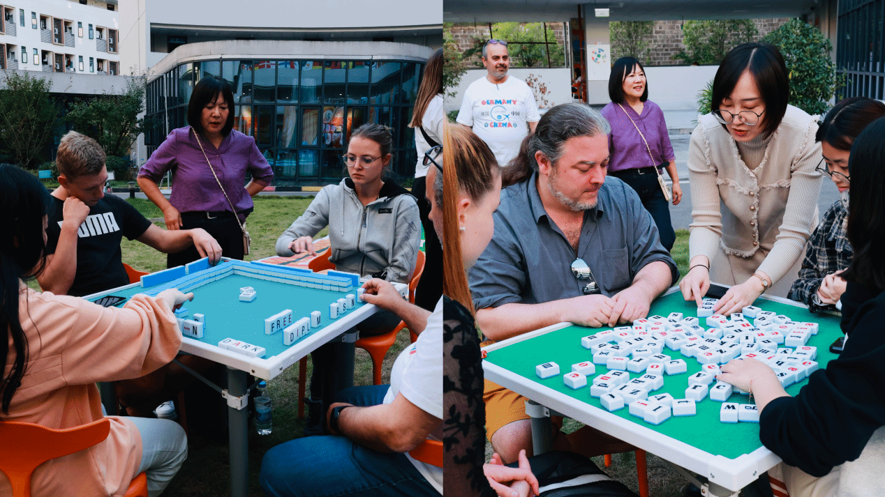报告结束,中德学生们一起在南湖书院草坪开展了外语麻将活动,为此次交流增添了别样的趣味。一个个特制的麻将牌上,印着德语字母和图案。学生们围坐在一起,好奇地打量着这些独特的麻将牌。外语麻将活动让大家在轻松愉快的氛围中学习语言。大家围坐在一起,一边打着麻将,一边用外语交流,笑声不断。